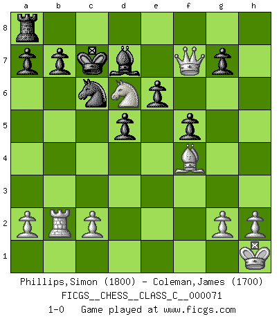 Last move : 1-0 2008 February 14 0:11:36 [Event "FICGS__CHESS__CLASS_C__000071"] [Site "FICGS"] [Date "2008.01.04"] [Round "1"] [White "Phillips,Simon"] [Black "Coleman,James"] [Result "1-0"] [WhiteElo "1800"] [BlackElo "1700"] 1.e4 Nf6 2.Nc3 d5 3.e5 Nfd7 4.d4 e6 5.Nf3 c5 6.dxc5 Bxc5 7.Bd3 Nc6 8.Bf4 Qb6 9.O-O Qxb2 10.Nb5 O-O 11.Bxh7+ Kxh7 12.Ng5+ Kg8 13.Qd3 f5 14.Qh3 Bxf2+ 15.Kh1 Rf7 16.Qh7+ Kf8 17.Qh8+ Ke7 18.Nd6 Ndxe5 19.Ngxf7 Kd7 20.Rab1 Bd4 21.Rxb2 Bxb2 22.Rb1 Nxf7 23.Qe8+ Kc7 24.Qxf7+ Bd7 25.Rxb2 1-0 Comment by player 2 : James Coleman : Had me worried for a sec. But I think I have enough to defend the king..(-: Alekhine's defense : Scandinavian variation Kingside Castling by player White (move 9) Kingside Castling by player Black (move 10) Player White won this chess game. Follow this game move after move (download)Every Pawn is a potential Queen. (James Mason) Nur ein wirklich starker Spieler weiß wie schwach er spielt. (Savielly Grigorievitsch Tartakower) Yo jugué Ajedrez con el y a veces le pude haber ganado solo que siempre devuelve su última jugada y juega la partida de manera diferente. (Mark Twain) Les Echecs sont et restent toujours un combat, un combat intégral comme la boxe, la lutte ou un autre sport, et où il doit y avoir un vainqueur et un vaincu. (Joseph Emil Diemer) Think like a man of action, act like a man of thought. (Henri Louis Bergson)