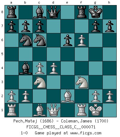 Last move : 1-0 2008 May 8 21:28:41 [Event "FICGS__CHESS__CLASS_C__000071"] [Site "FICGS"] [Date "2008.01.04"] [Round "1"] [White "Pech,Matej"] [Black "Coleman,James"] [Result "1-0"] [WhiteElo "1686"] [BlackElo "1700"] 1.e4 Nf6 2.e5 Nd5 3.d4 d6 4.c4 Nb6 5.f4 dxe5 6.fxe5 e6 7.Nc3 Nc6 8.Nf3 Bb4 9.Be2 O-O 10.O-O f6 11.exf6 1-0 Alekhine's defense : Four pawns attack Kingside Castling by player Black (move 9) Kingside Castling by player White (move 10) Player White won this chess game. Follow this game move after move (download)Chess is thirty to forty percent psychology. You don't have this when you play a computer. I can't confuse it. (Judith Polgar) Spielt Blackmar-Diemer-Gambit, und das Matt kommt von selbst! (Emil Joseph Diemer) El jugador blanco perdió porque fallo en recordar la coreccta continuación y tuvo que pensar por sí mismo las movidas. (Siegbert Tarrasch) À la honte des hommes, on sait que les lois du jeu sont les seules qui soient partout justes, claires, inviolables et exécutées. Pourquoi l'Indien qui a donné les règles du jeu d'échecs est-il obéi de bon gré dans toute la terre, et que les décrétales des papes, par exemple, sont aujourd'hui un objet d'horreur et de mépris ? C'est que l'inventeur des échecs combina tout avec justesse pour la satisfaction des joueurs, et que les papes, dans leurs décrétales, n'eurent en vue que leur seul avantage. L'Indien voulut exercer également l'esprit des hommes et leur donner du plaisir; les papes ont voulu abrutir l'esprit des hommes. Voltaire (Dictionnaire philosophique / Garnier 1967) There is far too much law for those who can afford it and far too little for those who cannot. (Derek Bok)