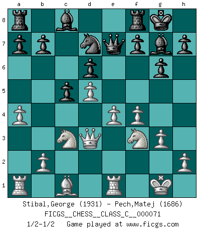 Last move : 1/2-1/2 2008 April 26 22:11:16 [Event "FICGS__CHESS__CLASS_C__000071"] [Site "FICGS"] [Date "2008.01.04"] [Round "1"] [White "Stibal,George"] [Black "Pech,Matej"] [Result "1/2-1/2"] [WhiteElo "1931"] [BlackElo "1686"] 1.d4 Nf6 2.c4 c5 3.d5 e6 4.Nc3 exd5 5.cxd5 d6 6.e4 g6 7.f4 Bg7 8.Bb5+ Nfd7 9.a4 Qh4+ 10.g3 Qe7 11.Bd3 O-O 12.Nf3 Na6 13.O-O Nb4 14.Re1 Nxd3 15.Qxd3 1/2-1/2 Benoni : pawn storm variation Kingside Castling by player Black (move 11) Kingside Castling by player White (move 13) This chess game ended in a draw. Follow this game move after move (download)There's never before been a Chess player with such a thorough knowledge of the intricacies of the game and such an absolutely indomitable will to win. I think Bobby is the greatest player that ever lived. (Lisa Lane) Besser ein falscher Plan, logisch durchgeführt, als gar kein Plan. (Viktor Kortschnoi) Tu no necesitas jugar muy bien, únicamente ayudar a tu oponenet a que juegue muy mal. (Genrikh Chepukaitis) Il n'y a plus de joueurs du niveau de Jacob Murray dont la seule quête est le beau jeu, le plaisir de voir les pièces construire quelque chose. Sur 10 idées à la minute, 9 seront sans intérêt, la dernière s'avèrera géniale. (Christian Bauer) Any activity becomes creative when the doer cares about doing it right or doing it better. (John Updike)