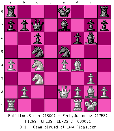 Last move : 0-1 2008 May 28 23:5:51 [Event "FICGS__CHESS__CLASS_C__000071"] [Site "FICGS"] [Date "2008.01.04"] [Round "1"] [White "Phillips,Simon"] [Black "Pech,Jaroslav"] [Result "0-1"] [WhiteElo "1800"] [BlackElo "1752"] 1.d4 d5 2.c4 c6 3.Nf3 Nf6 4.Nc3 dxc4 5.a4 Bf5 6.Ne5 Nbd7 7.Nxc4 Qc7 8.g3 e5 9.dxe5 Nxe5 10.Bf4 Nfd7 11.Bg2 f6 12.O-O Nc5 13.e4 Bg6 14.Qe2 Be7 0-1 QGD Slav : Krause attack Kingside Castling by player White (move 12) Player Black won this chess game. Follow this game move after move (download)Later, I began to succeed in decisive games. Perhaps because I realized a very simple truth: not only was I worried, but also my opponent. (Mikhail Tal) Es liegt in der Natur, vernüftig zu denken und unlogisch zu handeln. (Anatole France) Un buen sacrificio es aquel que aunque no sea necesariamente sólido, deja a tu oponente aturdido y confuso. (Rudolph Spielmann) Karpov est une pièce de musée. (Garry Kasparov) Everything in life is luck. (Donald Trump)