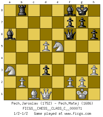 Last move : 1/2-1/2 2008 September 24 2:29:2 [Event "FICGS__CHESS__CLASS_C__000071"] [Site "FICGS"] [Date "2008.01.04"] [Round "1"] [White "Pech,Jaroslav"] [Black "Pech,Matej"] [Result "1/2-1/2"] [WhiteElo "1752"] [BlackElo "1686"] 1.e4 e5 2.Nf3 Nc6 3.Bb5 a6 4.Ba4 Nf6 5.O-O Be7 6.Re1 b5 7.Bb3 d6 8.c3 O-O 9.h3 Bb7 10.d4 Re8 11.Nbd2 Bf8 12.a4 h6 13.Bc2 exd4 14.cxd4 Nb4 15.Bb1 c5 16.d5 Nd7 17.Ra3 c4 18.Nd4 Qf6 19.N2f3 Nc5 20.axb5 axb5 21.Nxb5 Rxa3 22.Nxa3 Ba6 23.Re3 Rb8 24.e5 dxe5 25.Nxe5 Ncd3 26.Bxd3 Nxd3 27.Rxd3 cxd3 1/2-1/2 Ruy Lopez : Closed Kingside Castling by player White (move 5) Kingside Castling by player Black (move 8) This chess game ended in a draw. Follow this game move after move (download)If your opponent offers you a draw, try to work out why he thinks he's worse off. (Nigel Short) Ich habe die Schachforschung dermaßen betrieben, dass sie auf eine wissenschaftliche Basis gestellt wurde. (Mikhail Moiseyevich Botvinik) Cuando me preguntan: -¿Cual es el secreto que te hace hacer mejores movidas que tus oponentes?, Yo respondo: Me da gusto que me pregunten eso, porque, como veran, hay una simple razón. Yo pienso mis propias movidas y dejo a mi oponente que el piense las suyas. (Alexander Alekhine) La menace est plus forte que l'exécution. (Aaron Nimzovitch) Imagination is more important than knowledge. Knowledge is limited. Imagination encircles the world. (Albert Einstein)
