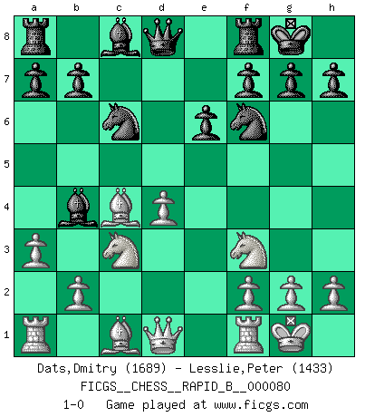 Last move : 1-0 2008 January 21 1:6:29 [Event "FICGS__CHESS__RAPID_B__000080"] [Site "FICGS"] [Date "2008.01.06"] [Round "1"] [White "Dats,Dmitry"] [Black "Lesslie,Peter"] [Result "1-0"] [WhiteElo "1689"] [BlackElo "1433"] 1.d4 Nf6 2.c4 e6 3.Nc3 Bb4 4.Nf3 O-O 5.e3 c5 6.Bd3 cxd4 7.exd4 d5 8.O-O dxc4 9.Bxc4 Nc6 10.a3 1-0 Nimzo-Indian : Three knights variation Kingside Castling by player Black (move 4) Kingside Castling by player White (move 8) Player White won this chess game. Follow this game move after move (download)Bobby just drops the pieces and they fall on the right squares. (Miguel Najdorf) Frage: Gibt es etwas was Sie mehr lieben als Autobahnen ohne Tempobegrenzungen? - Antwort: Deutsche Frauen ohne Tempobegrenzungen. (Loek van Wely) El muchacho (en ese entonces un niño de 12 años llamado Anatoly Karpov) no tiene ni idea de lo que es el Ajedrez y no hay futuro en absoluto para el en esta profesión. (Mikhail Botvinnik) Plusieurs personnes se sont demandées comment Tal faisait pour gagner... En fait, c'est très simple ! Il met ses pièces au centre de l'échiquier et les sacrifie quelque part ! (David Bronstein) When you don't know what to do, walk fast and look worried. (Anonymous)