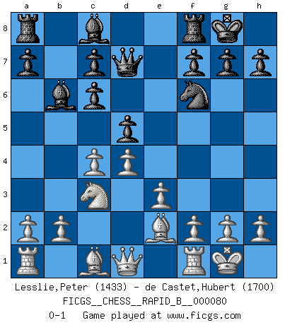 Last move : 0-1 2008 January 21 17:17:3 [Event "FICGS__CHESS__RAPID_B__000080"] [Site "FICGS"] [Date "2008.01.06"] [Round "1"] [White "Lesslie,Peter"] [Black "de Castet,Hubert"] [Result "0-1"] [WhiteElo "1433"] [BlackElo "1700"] 1.Nf3 e5 2.Nxe5 Nc6 3.Nxc6 bxc6 4.e3 Bc5 5.d4 Bb6 6.c4 d5 7.Nc3 Nf6 8.Be2 O-O 9.O-O Qd7 0-1 Reti Opening Kingside Castling by player Black (move 8) Kingside Castling by player White (move 9) Player Black won this chess game. Follow this game move after move (download)Bobby Fischer's current state of mind is indeed a tragedy. One of the world's greatest Chess players - the pride and sorrow of American Chess. (Frank Brady) Man gibt nur Pakete auf. (Paul Keres) El poder defensivo de una pieza clavada, solamente es imaginario. (Aaron Nimzovich) Nous vivons dans un monde échiquéen : chaque jour qui passe est un défi à relever. (Philosophe Sasha) He is a liar. I just don't know what the lie is yet. (Horatio Caine, C.S.I. Miami)