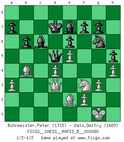 Last move : 1/2-1/2 2008 April 13 6:48:5 [Event "FICGS__CHESS__RAPID_B__000080"] [Site "FICGS"] [Date "2008.01.06"] [Round "1"] [White "Buhrmeister,Peter"] [Black "Dats,Dmitry"] [Result "1/2-1/2"] [WhiteElo "1715"] [BlackElo "1689"] 1.e4 e6 2.d4 d5 3.e5 c5 4.c3 Nc6 5.Nf3 Qb6 6.a3 c4 7.Nbd2 Na5 8.Be2 Bd7 9.O-O Ne7 10.Rb1 h6 11.Qc2 Ng6 12.g3 Be7 13.h4 O-O-O 14.b3 cxb3 15.Nxb3 Ba4 16.Nfd2 h5 17.Qa2 Nxb3 18.Nxb3 Qc7 19.Qb2 Rd7 20.Nd2 Qc6 21.Nf3 Rc7 22.Bd2 Rf8 23.Rfc1 Qd7 24.c4 dxc4 25.Bxc4 Kb8 26.Ba5 Rc6 27.Rc3 Rfc8 28.Rbc1 b6 29.Bb4 R6c7 30.Be2 Rxc3 31.Rxc3 Bc6 32.Rc1 Qd5 33.Rc3 Bb7 34.Rxc8+ Kxc8 35.Qc3+ Kd7 36.Qc2 Bc6 37.Qd3 1/2-1/2 French : Advance, Paulsen attack Kingside Castling by player White (move 9) Queenside Castling by player Black (move 13) This chess game ended in a draw. Follow this game move after move (download)You must take your opponent into a deep dark forest where 2+2=5, and the path leading out is only wide enough for one. (Mikhail Tal) Später, ... hatte ich zunehmend Erfolg in entscheidenden Partien. Vielleicht weil ich eine einfache Wahrheit erkannte: nicht nur ich hatte Angst, auch mein Gegner. (Mikhail Nekhemyevich Tal) En el Ajedrez, tal como en la vida, las bendiciones de hoy pueden ser el veneno del mañana. (Assaic) Les réformistes prétendent que les progrès de la théorie conduiront à la disparition des échecs, et qu'il faut, pour leur rendre vie, en remanier les règles. En réalité, qu'exprime cette affirmation? Le mépris de l'intuition, de l'imagination et de tous les autres éléments qui font des échecs un art. (Alexander Alekhine) Train yourself to let go of everything you fear to lose. (Master Yoda in Star Wars ep.3)