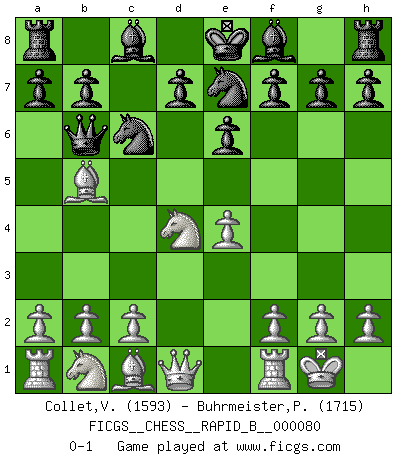 Last move : 0-1 2008 February 19 1:48:51 [Event "FICGS__CHESS__RAPID_B__000080"] [Site "FICGS"] [Date "2008.01.06"] [Round "1"] [White "Collet,Vincent"] [Black "Buhrmeister,Peter"] [Result "0-1"] [WhiteElo "1593"] [BlackElo "1715"] 1.e4 c5 2.Nf3 Nc6 3.Bb5 e6 4.O-O Nge7 5.d4 cxd4 6.Nxd4 Qb6 0-1 This chess game has been lost on time (started : 2008.01.06 8:49:19) Sicilian : Nimzovich-Rossolimo attack (without ...d6) Kingside Castling by player White (move 4) Player Black won this chess game. Follow this game move after move (download)It is no time to be playing Chess when the house is on fire. (Italian Proverb) Schach ist die gewalttätigste aller Sportarten. (Garry Kasparov) La estratégia requiere pensar, la táctica requiere observación. (Max Euwe) Seul un grand joueur sait à quel point il joue faiblement. (Xavier Tartacover) A belief is an idea the mind possesses, an idea that possesses the mind. (Robert Oxden Bolton)