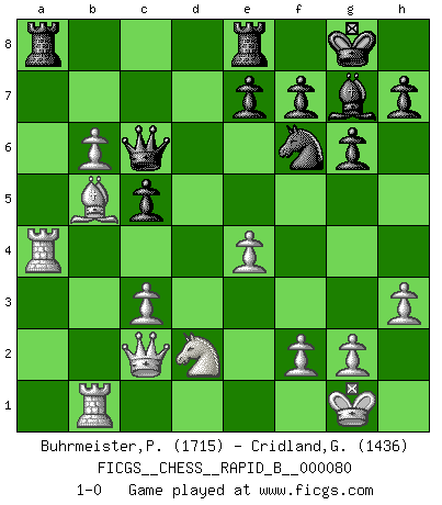Last move : 1-0 2008 March 14 23:13:27 [Event "FICGS__CHESS__RAPID_B__000080"] [Site "FICGS"] [Date "2008.01.06"] [Round "1"] [White "Buhrmeister,Peter"] [Black "Cridland,Graham"] [Result "1-0"] [WhiteElo "1715"] [BlackElo "1436"] 1.e4 c5 2.Nf3 d6 3.Be2 Nf6 4.c3 g6 5.O-O Bg7 6.d3 Nc6 7.h3 O-O 8.Be3 Qc7 9.Nbd2 b5 10.d4 c4 11.a4 Ba6 12.d5 Nd8 13.axb5 Bxb5 14.Nd4 Bd7 15.Qc2 Nb7 16.Nxc4 Nc5 17.Nd2 a5 18.b4 Nb7 19.b5 Nc5 20.Nc6 Rfe8 21.Rfb1 a4 22.b6 Qb7 23.Bxc5 dxc5 24.Rxa4 Bxc6 25.dxc6 Qxc6 26.Bb5 1-0 Sicilian Kingside Castling by player White (move 5) Kingside Castling by player Black (move 7) Player White won this chess game. Follow this game move after move (download)Nowadays, when you're not a grandmaster at 14, you can forget about it. (Anand Viswanathan) Es war undenkbar für die Behörden, dass ein sowjetischer Großmeister auf diese Art und Weise [Fischer-Taimanov 6:0] verliert, ohne dass es eine politischer Erklärung dafür gäbe. (Mark Taimanov) Yo considero que Fischer es uno de los expertos mas grandes de aperturas de siempre. (Keith Hayward) Celui qui prend des risques peut perdre, celui qui n'en prend pas perd toujours. (Xavier Tartacover) You must have a dream in order to have it come true. (A.P.J. Kalam)