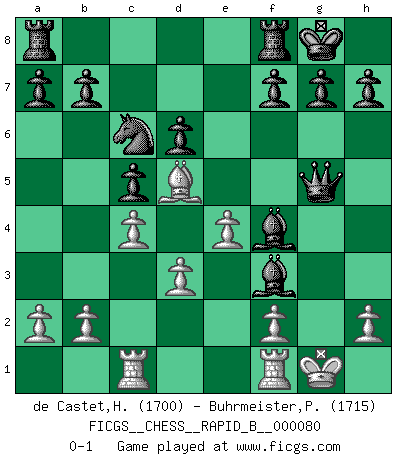 Last move : 0-1 2008 February 16 17:31:19 [Event "FICGS__CHESS__RAPID_B__000080"] [Site "FICGS"] [Date "2008.01.06"] [Round "1"] [White "de Castet,Hubert"] [Black "Buhrmeister,Peter"] [Result "0-1"] [WhiteElo "1700"] [BlackElo "1715"] 1.e4 c5 2.Nf3 Nc6 3.Nc3 e6 4.Bc4 Nf6 5.O-O d6 6.d3 Be7 7.Bf4 O-O 8.Qe2 e5 9.Nd5 exf4 10.Ng5 Nxd5 11.Bxd5 Bxg5 12.Qg4 Bxg4 13.Rae1 f3 14.gxf3 Bxf3 15.c4 Bf4 16.Rc1 Qg5+ 0-1 Sicilian defense Kingside Castling by player White (move 5) Kingside Castling by player Black (move 7) Player Black won this chess game. Follow this game move after move (download)Chess is a sea in which a gnat may drink and an elephant may bathe. (Hindu proverb) Ich rechne überhaupt nicht voraus. Ich gewinne auch so. (Robert James Fischer) No existe un remordimiento como el remordimiento del Ajedrez. (H. G. Wells) L'ordinateur a tué l'originalité. Il n'y a plus guère d'aventures sur l'échiquier. (Jacob Murray) Pretend inferiority and encourage his arrogance. (Sun Tzu)