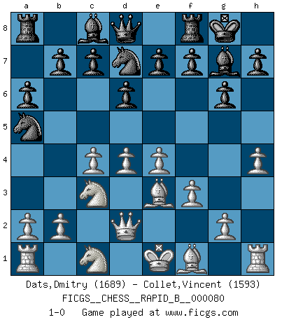 Last move : 1-0 2008 February 19 1:48:51 [Event "FICGS__CHESS__RAPID_B__000080"] [Site "FICGS"] [Date "2008.01.06"] [Round "1"] [White "Dats,Dmitry"] [Black "Collet,Vincent"] [Result "1-0"] [WhiteElo "1689"] [BlackElo "1593"] 1.d4 Nf6 2.c4 g6 3.Nc3 Bg7 4.e4 d6 5.f3 O-O 6.Be3 Nc6 7.Nge2 a6 8.Qd2 Na5 9.Nc1 Nd7 10.h4 1-0 This chess game has been lost on time (started : 2008.01.06 8:49:19) King's Indian : Saemisch, Panno formation Kingside Castling by player Black (move 5) Player White won this chess game. Follow this game move after move (download)A bad plan is better than none at all. (Frank Marshall) Schach ist wie eine schöne Frau, zu der wir ständig zurückkehren, gleichviel, wie oft sie uns zurückweist. (Anonymous) El arma más poderosa en el Ajedrez, es tener la próxima movida. (David Bronstein) Les Echecs sont et restent toujours un combat, un combat intégral comme la boxe, la lutte ou un autre sport, et où il doit y avoir un vainqueur et un vaincu. (Joseph Emil Diemer) Coffee just isn't my cup of tea. (Unknown)