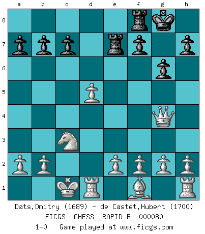 Last move : 1-0 2008 January 30 12:42:7 [Event "FICGS__CHESS__RAPID_B__000080"] [Site "FICGS"] [Date "2008.01.06"] [Round "1"] [White "Dats,Dmitry"] [Black "de Castet,Hubert"] [Result "1-0"] [WhiteElo "1689"] [BlackElo "1700"] 1.d4 d5 2.c4 Nc6 3.Nf3 Nf6 4.Nc3 Bf5 5.Qb3 e5 6.Be3 Bb4 7.dxe5 O-O 8.exf6 Qxf6 9.cxd5 Ne5 10.Qxb4 Rad8 11.Nxe5 Qxe5 12.Bf4 Qxf4 13.Qxf4 Rde8 14.Qxf5 g6 15.Qg4 Re7 16.O-O-O 1-0 QGD : Chigorin defense Kingside Castling by player Black (move 7) Queenside Castling by player White (move 16) Player White won this chess game. Follow this game move after move (download)I feel as if I were a piece in a game of Chess, when my opponent says of it: That piece cannot be moved. (Soren Kierkegaard) Viele Opfer benötigen überhaupt keine konkrete Berechnung. Es genügt sich die entstehende Position kurz vorzustellen, um uns davon zu überzeugen, dass das Opfer korrekt ist. (Mikhail Nekhemyevich Tal) Juega la Apertura como un libro, el Juego Medio como un mago y los Finales como una máquina. (Spielmann) À la honte des hommes, on sait que les lois du jeu sont les seules qui soient partout justes, claires, inviolables et exécutées. Pourquoi l'Indien qui a donné les règles du jeu d'échecs est-il obéi de bon gré dans toute la terre, et que les décrétales des papes, par exemple, sont aujourd'hui un objet d'horreur et de mépris ? C'est que l'inventeur des échecs combina tout avec justesse pour la satisfaction des joueurs, et que les papes, dans leurs décrétales, n'eurent en vue que leur seul avantage. L'Indien voulut exercer également l'esprit des hommes et leur donner du plaisir; les papes ont voulu abrutir l'esprit des hommes. Voltaire (Dictionnaire philosophique / Garnier 1967) Warrior pose battles inner weakness and wins focus. You see that there is no war within you. You're on your own side, and you are your own strength. (Terri Guillemets)