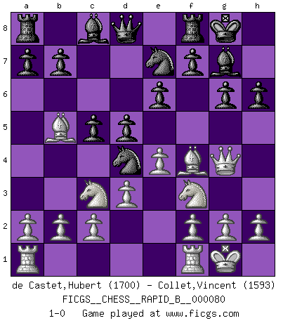 Last move : 1-0 2008 February 18 13:39:10 [Event "FICGS__CHESS__RAPID_B__000080"] [Site "FICGS"] [Date "2008.01.06"] [Round "1"] [White "de Castet,Hubert"] [Black "Collet,Vincent"] [Result "1-0"] [WhiteElo "1700"] [BlackElo "1593"] 1.e4 c5 2.Nf3 Nc6 3.Nc3 g6 4.Bc4 Bg7 5.O-O e6 6.d3 Nge7 7.Bf4 d5 8.Bb5 O-O 9.Ng5 Nd4 10.Qg4 h6 11.Nf3 1-0 This chess game has been lost on time (started : 2008.01.06 8:49:19) Sicilian defense Kingside Castling by player White (move 5) Kingside Castling by player Black (move 8) Player White won this chess game. Follow this game move after move (download)Pawn endings are to Chess what putting is to golf. (Cecil Purdy) Fischer: 'Remis!?' Uhlmann: 'Aber es muss doch dreimal Zugwiederholung sein!' Fischer: 'Sie nehmen das Remis an, wie ich es sage, sonst spiele ich weiter und werde Sie dann schlagen!' (Robert James Fischer) Aunque la mayoría de la gente disfruta observar las partidas de los grandes Maestros de ataque, algunos de los jugadores mas notables en la historia han sido los jugadores silenciosos posicionales. Lentamente ellos te aplastan despojandote de tu espacio, congestionando tus piezas y dejandote virtualmente sin nada que hacer. (Yasser Seirawan) Des combinaisons [dans le jeu d'échecs] pareilles à des mélodies. Je crois entendre pour ainsi dire la musique des coups... (Vladimir Nabokov) Big Chess is a place for big hallucinations. (Thibault de Vassal)