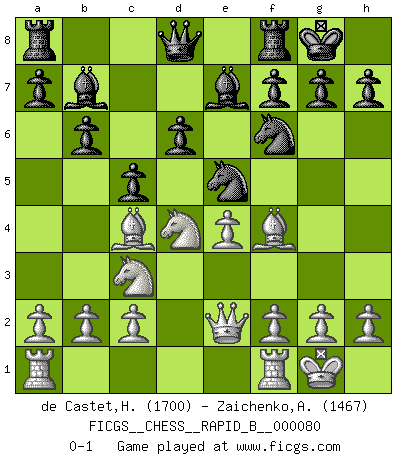 Last move : 0-1 2008 January 30 12:42:30 [Event "FICGS__CHESS__RAPID_B__000080"] [Site "FICGS"] [Date "2008.01.06"] [Round "1"] [White "de Castet,Hubert"] [Black "Zaichenko,Andrey"] [Result "0-1"] [WhiteElo "1700"] [BlackElo "1467"] 1.e4 e5 2.Nf3 d6 3.Nc3 Nf6 4.Bc4 Be7 5.O-O O-O 6.d4 exd4 7.Nxd4 b6 8.Nd5 Bb7 9.Qe1 Nbd7 10.Bf4 c6 11.Nc3 Ne5 12.Qe2 c5 0-1 Philidor's defense Kingside Castling by player White (move 5) Kingside Castling by player Black (move 5) Player Black won this chess game. Follow this game move after move (download)Mistrust is the most necessary characteristic of the Chess player. (Siegbert Tarrasch) Kasparov stellt für gewöhnlich die Regeln auf und bricht sie dann selbst wieder. (Alexej Shirov) Prefiero perder una partida realmente buena, que ganar una mala. (David Levy) Vous n'êtes pas toujours obligé de jouer le meilleur coup. Un coup doit être actif, entreprenant, correct et beau ! (David Bronstein) Dave, my mind is going. I can feel it. (HAL 9000 in 2001, a space odyssey)