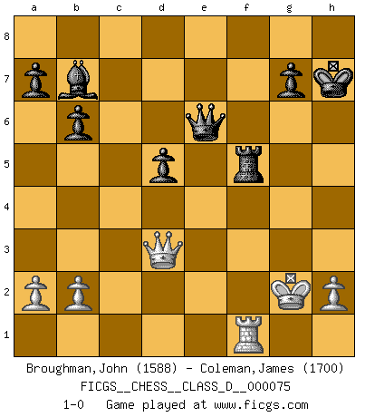 Last move : 1-0 2008 May 11 9:33:1 [Event "FICGS__CHESS__CLASS_D__000075"] [Site "FICGS"] [Date "2008.01.06"] [Round "1"] [White "Broughman,John"] [Black "Coleman,James"] [Result "1-0"] [WhiteElo "1588"] [BlackElo "1700"] 1.d4 f5 2.Nf3 e6 3.e3 Nf6 4.Bd3 b6 5.Nbd2 Bb7 6.O-O Be7 7.Re1 O-O 8.e4 fxe4 9.Nxe4 c5 10.Bg5 Nxe4 11.Bxe7 Nxf2 12.Kxf2 Qxe7 13.Be4 d5 14.Bd3 Nc6 15.Kg1 cxd4 16.Nxd4 Nxd4 17.Bxh7+ Kxh7 18.Qxd4 Rac8 19.Re3 Rf5 20.Rae1 Rxc2 21.Rxe6 Qf7 22.Qd3 Qxe6 23.Rf1 Rxg2+ 24.Kxg2 1-0 Dutch Kingside Castling by player White (move 6) Kingside Castling by player Black (move 7) Player White won this chess game. Follow this game move after move (download)He who fears an isolated Queen's Pawn should give up Chess. (Siegbert Tarrasch) Ich bin es gewohnt, das die Jugend mir überhaupt keinen Respekt entgegenbringt. (Alexander Morozewich) El Ajedrez te enseña a controlarl la excitación inicial que sientes cuando vez algo que parece bueno y te enseña a pensar objetivamente cuando te encuentras en problemas. (Stanley Kubrick) Que feriez-vous si vous étiez en train de jouer aux échecs et que la fin du monde arrive ? Je continuerais à jouer. (Saint Borromée) Do not put your faith in what statistics say until you have carefully considered what they do not say. (William W. Watt)