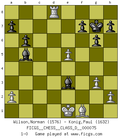 Last move : 1-0 2008 May 30 11:12:53 [Event "FICGS__CHESS__CLASS_D__000075"] [Site "FICGS"] [Date "2008.01.06"] [Round "1"] [White "Wilson,Norman"] [Black "Konig,Paul"] [Result "1-0"] [WhiteElo "1576"] [BlackElo "1632"] 1.d4 Nf6 2.c4 g6 3.Nc3 d5 4.cxd5 Nxd5 5.e4 Nxc3 6.bxc3 Bg7 7.Nf3 O-O 8.Be2 c5 9.Rb1 cxd4 10.cxd4 Nc6 11.d5 Ne5 12.Nxe5 Bxe5 13.O-O Qc7 14.f4 Bg7 15.Ba3 Re8 16.Qd2 b6 17.Rbc1 Qd8 18.Qe3 Bb7 19.Bb5 Rf8 20.Rfd1 Rc8 21.e5 Rxc1 22.Qxc1 Bh6 23.d6 exd6 24.Bxd6 Qh4 25.Bxf8 Bxf4 26.g3 Qh3 27.Bf1 Bxc1 28.Bxh3 Be3+ 29.Kf1 Kxf8 30.Rd8+ Kg7 31.Bg2 Ba6+ 32.Ke1 Bb5 33.Bf1 1-0 King's Indian defense, 3.Nc3 Kingside Castling by player Black (move 7) Kingside Castling by player White (move 13) Player White won this chess game. Follow this game move after move (download)Chess is a matter of delicate judgment, knowing when to punch and how to duck. (Bobby Fischer) Ich verlor meine Bürgerrechte, mein Gehalt wurde mir nicht mehr bezahlt und ich wurde zensiert und durfte nicht mehr ins Ausland reisen. [nach dem Match Fischer-Taimanov 6:0] (Mark Taimanov) Cualquier cambio de material en una posición debe venir por medio de un mate, una captura o promoción de Peón. (Purdy) Le jeu d'échecs fait naître et fortifie en nous plusieurs qualités précieuses dans le cours de l'existence, telles que la prévoyance, la circonspection, la prudence, et la persévérance. (Benjamin Franklin - 1783, la morale des échecs) A bird doesn't sing because it has an answer, it sings because it has a song. (Maya Angelou)