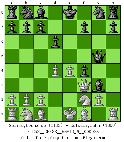 Last move : 0-1 2008 February 18 1:38:17 [Event "FICGS__CHESS__RAPID_A__000036"] [Site "FICGS"] [Date "2008.01.08"] [Round "1"] [White "Solino,Leonardo"] [Black "Colucci,John"] [Result "0-1"] [WhiteElo "2182"] [BlackElo "1800"] 1.e4 e5 2.f4 exf4 3.Nf3 g5 4.h4 g4 5.Ne5 d6 6.Nxg4 Be7 7.d4 Bxh4+ 8.Nf2 Qg5 9.Qf3 Bg3 0-1 This chess game has been lost on time (started : 2008.01.08 6:39:22) KGA : Kieseritsky, Kolisch defense Player Black won this chess game. Follow this game move after move (download)My God, Bobby Fischer plays so simply. (Alexei Suetin) Ich glaube, ich kenne inzwischen die Gründe für mein Versagen: schachliche Charakterfehler. Ich war nie ein Wunderkind und in meiner gesamten menschlichen Entwicklung immer zu langsam. (Viktor Kortschnoi) Fischer sacrificó virtualmente todo lo que la mayoría de nosotros los 'debiles' (término que él usa) valoramos, respetamos y apreciamos por el amor de un astuto, a menudo hermoso tablero de juego, por el privilegio ambivalente de ser su mas grande maestro. (Paul Kollar) Le profane ne songe pas à la somme de jouissance dont il se prive, qui méconnaît ce jeu aux ressources aussi variées que passionnantes. (Jean-Marie Jeanton-Lamarche) No man has ever achieved immortality in his own life time. (Unknown)