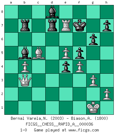 Last move : 1-0 2008 May 22 7:16:8 [Event "FICGS__CHESS__RAPID_A__000036"] [Site "FICGS"] [Date "2008.01.08"] [Round "1"] [White "Bernal Varela,Nelson"] [Black "Biason,Adriano"] [Result "1-0"] [WhiteElo "2003"] [BlackElo "1800"] 1.e4 c5 2.Nf3 d6 3.d4 cxd4 4.Nxd4 Nf6 5.Nc3 Bd7 6.Be2 e6 7.O-O Be7 8.f4 Nc6 9.Be3 O-O 10.Qd2 Nxd4 11.Bxd4 Bc6 12.Qd3 d5 13.e5 Ne4 14.Nxe4 dxe4 15.Qe3 b6 16.Rfd1 Bb7 17.c3 Qc7 18.b4 Rfd8 19.a4 Rab8 20.a5 Bc6 21.Kf2 Bd5 22.axb6 axb6 23.Ra6 b5 24.Bb6 Qb7 25.Bxb5 Rdc8 26.c4 Bxc4 27.Rd7 Bxb5 28.Rxb7 Rxb7 29.Ra5 Bd3 30.Bc5 Bh4+ 31.Kg1 f5 32.Qd4 Rd8 33.Qa1 R8d7 34.Ra8+ Kf7 35.Rh8 Kg6 36.Re8 Bc4 37.g3 Bd8 38.Qc3 Bb5 39.Rxe6+ Kf7 40.Qb3 g6 41.Re7+ 1-0 Sicilian Kingside Castling by player White (move 7) Kingside Castling by player Black (move 9) Player White won this chess game. Follow this game move after move (download)By the beauty of his games, the clarity of his play, and the brilliance of his ideas, Fischer made himself an artist of the same stature as Brahms, Rembrandt, and Shakespeare. (David Levy) Mein Name ist Rustam Kamsky. Sie haben meinen Sohn belästigt. Bereiten Sie sich aufs Sterben vor. (Rustam Kamsky) A la fecha, Fischer esta simplemente un nivel arriba de todos los mejores jugadores de Ajedrez del mundo. (John Jacobs) En blitz, le Cavalier l'emporte sur le Fou. (Vlastimil Hort) All the biggest technological inventions created by man - the airplane, the automobile, the computer - says little about his intelligence, but speaks volumes about his laziness. (Mark Kennedy)