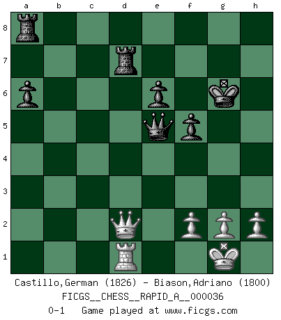 Last move : 0-1 2008 May 5 9:11:49 [Event "FICGS__CHESS__RAPID_A__000036"] [Site "FICGS"] [Date "2008.01.08"] [Round "1"] [White "Castillo,German"] [Black "Biason,Adriano"] [Result "0-1"] [WhiteElo "1826"] [BlackElo "1800"] 1.e4 c5 2.d4 cxd4 3.c3 dxc3 4.Nxc3 d6 5.Bc4 Nc6 6.Nf3 e6 7.O-O Nf6 8.Qe2 Bd7 9.Rd1 Qb8 10.Bg5 Be7 11.Rd2 a6 12.Rad1 h6 13.Bh4 b5 14.e5 Nxe5 15.Nxe5 dxe5 16.Bxf6 Bxf6 17.Rxd7 bxc4 18.Ne4 O-O 19.Nxf6+ gxf6 20.Qg4+ Kh8 21.Qh3 Kg8 22.b3 cxb3 23.Qxh6 e4 24.Qxf6 bxa2 25.Qg5+ Kh7 26.Qh4+ Kg7 27.Qxe4 Rd8 28.Qd4+ Kg6 29.Qd3+ Kh6 30.Qd2+ Kg6 31.Qc2+ f5 32.Qxa2 Qe5 33.Qd2 Rxd7 0-1 This chess game has been lost on time (started : 2008.01.08 6:39:22) Sicilian : Smith-Morra gambit Kingside Castling by player White (move 7) Kingside Castling by player Black (move 18) Player Black won this chess game. Follow this game move after move (download)Human affairs are like a Chess game: only those who do not take it seriously can be called good players. (Hung Tzu Ch'eng) Matt entspricht nicht immer den Tatsachen. (Savielly Grigorievitsch Tartakower) Una clavada es mas poderosa que una espada. (Fred Reinfeld) Tout change constamment, y compris dans le monde des Echecs. (Botvinnik) Either move or be moved. (Ezra Pound)