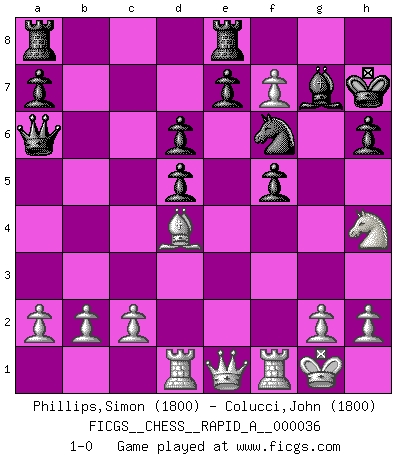 Last move : 1-0 2008 February 22 15:14:30 [Event "FICGS__CHESS__RAPID_A__000036"] [Site "FICGS"] [Date "2008.01.08"] [Round "1"] [White "Phillips,Simon"] [Black "Colucci,John"] [Result "1-0"] [WhiteElo "1800"] [BlackElo "1800"] 1.d4 d6 2.e4 Nf6 3.Nc3 g6 4.Nf3 Bg7 5.Be2 O-O 6.O-O Bg4 7.Be3 Nc6 8.d5 Nb8 9.Ng5 Bxe2 10.Qxe2 c6 11.f4 h6 12.Nf3 Qa5 13.Rad1 Qa6 14.Qe1 Nbd7 15.dxc6 bxc6 16.Bd4 Rfe8 17.e5 Nd5 18.e6 N7f6 19.f5 gxf5 20.Nxd5 cxd5 21.Nh4 Kh7 22.exf7 1-0 Queen's Pawn Kingside Castling by player Black (move 5) Kingside Castling by player White (move 6) Player White won this chess game. Follow this game move after move (download)The passion for playing Chess is one of the most unaccountable in the world. (H.G. Wells) Bis zum Jahr 1971 verlief in meiner Schachkariere alles glatt. Dieses dramatische Match [Fischer-Taimanov 6:0] machte mein Leben zur Hölle. (Mark Taimanov) Solo existe una cosa que Fischer hace en el Ajedrez sin placer: ¡perder!. (Boris Spassky) On peut tirer plus d'utilité d'une partie perdue que de 100 parties gagnées. (Capablanca) Without deviation from the norm, progress is not possible. (Frank Zappa)