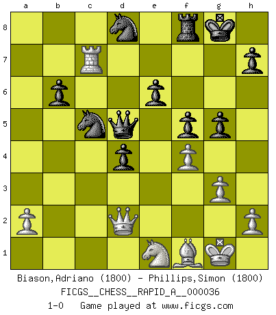 Last move : 1-0 2008 May 10 9:32:18 [Event "FICGS__CHESS__RAPID_A__000036"] [Site "FICGS"] [Date "2008.01.08"] [Round "1"] [White "Biason,Adriano"] [Black "Phillips,Simon"] [Result "1-0"] [WhiteElo "1800"] [BlackElo "1800"] 1.e4 c6 2.d4 d5 3.e5 Bf5 4.Nf3 e6 5.Be2 Nd7 6.O-O Ne7 7.Nh4 Be4 8.Nd2 c5 9.c3 Nc6 10.Nxe4 dxe4 11.g3 Be7 12.Ng2 Qb6 13.Be3 Qxb2 14.Rb1 Qxc3 15.Rxb7 cxd4 16.Bb5 Ndxe5 17.Bf4 O-O 18.Qb1 Qa3 19.Qxe4 f5 20.Qc2 Nd8 21.Rc7 Nf3+ 22.Kh1 Bd6 23.Bxd6 Qxd6 24.Rd7 Qb6 25.Rb1 Rb8 26.Rb3 Ne5 27.Bd3 Qc6 28.Rc7 Qa8 29.Ba6 Rb6 30.Rxb6 axb6 31.Bf1 Qd5 32.f4 Nd7 33.Kg1 Nc5 34.Ne1 g5 35.Qd2 1-0 This chess game has been lost on time (started : 2008.01.08 6:39:22) Caro-Kann : Advance variation Kingside Castling by player White (move 6) Kingside Castling by player Black (move 17) Player White won this chess game. Follow this game move after move (download)In blitz, the Knight is stronger than the Bishop. (Vlastimil Hort) Ich spiele ehrlich und spiele, um zu gewinnen. Wenn ich verliere nehme ich meine Medizin. (Robert James Fischer) Fischer sacrificó virtualmente todo lo que la mayoría de nosotros los 'debiles' (término que él usa) valoramos, respetamos y apreciamos por el amor de un astuto, a menudo hermoso tablero de juego, por el privilegio ambivalente de ser su mas grande maestro. (Paul Kollar) Que feriez-vous si vous étiez en train de jouer aux échecs et que la fin du monde arrive ? Je continuerais à jouer. (Saint Borromée) Indecision is the key to flexibility. (Unknown)