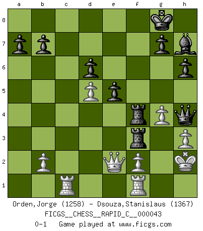 Last move : 0-1 2008 January 22 18:47:32 [Event "FICGS__CHESS__RAPID_C__000043"] [Site "FICGS"] [Date "2008.01.08"] [Round "1"] [White "Orden,Jorge"] [Black "Dsouza,Stanislaus"] [Result "0-1"] [WhiteElo "1258"] [BlackElo "1367"] 1.e4 e5 2.Nf3 Nc6 3.Bc4 h6 4.O-O d6 5.h3 Nf6 6.Re1 Na5 7.Bb3 Nxb3 8.axb3 Be7 9.d4 O-O 10.d5 c6 11.c4 cxd5 12.Nc3 dxc4 13.bxc4 Be6 14.Nd5 Nxd5 15.cxd5 Bd7 16.Be3 f5 17.exf5 Bxf5 18.g4 Bh7 19.Kh2 Bh4 20.Nxh4 Qxh4 21.Rc1 Rf7 22.Rf1 Raf8 23.Qe2 Rf3 24.Bf4 R8xf4 0-1 King's pawn game Kingside Castling by player White (move 4) Kingside Castling by player Black (move 9) Player Black won this chess game. Follow this game move after move (download)Chess, like any creative activity, can exist only through the combined efforts of those who have creative talent, and those who have the ability to organize their creative work. (Mikhail Botvinnik) Frage des Reporters: -Welche besonderen Umstände rechtfertigen das Anhalten der Uhren während einer Turnierpartie? Antwort: -Einen Fotographen zu strangulieren. (Siegbert Tarrasch) Cuando tengo las piezas blancas, yo gano porque soy blanco; Cuando tengo las piezas negras, yo gano porque soy Bogolyubov. (Bogolyubov) Les échecs, c'est la lutte contre l'erreur. (Johannes Zukertort) It is the aim of the modern school, not to treat every position according to one general law, but according to the principle inherent in the position. (Richard Reti)