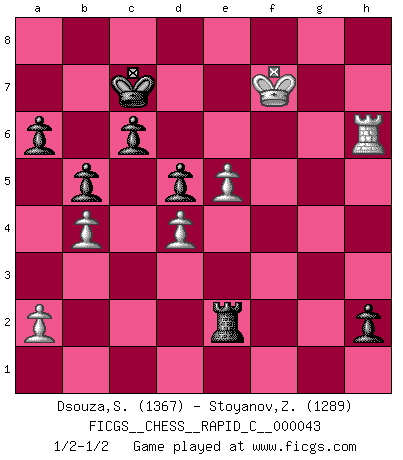 Last move : 1/2-1/2 2008 February 15 14:39:39 [Event "FICGS__CHESS__RAPID_C__000043"] [Site "FICGS"] [Date "2008.01.08"] [Round "1"] [White "Dsouza,Stanislaus"] [Black "Stoyanov,Zdravko"] [Result "1/2-1/2"] [WhiteElo "1367"] [BlackElo "1289"] 1.d4 d5 2.Nf3 Nc6 3.c3 Bg4 4.e3 e6 5.h3 Bh5 6.Be2 Bd6 7.g4 Bg6 8.Bd3 Bxd3 9.Qxd3 Nf6 10.Nbd2 h6 11.b4 a6 12.g5 hxg5 13.Nxg5 Nd7 14.f4 Qf6 15.Ndf3 O-O-O 16.Bd2 Nb6 17.O-O-O Nc4 18.e4 Be7 19.Ne5 N6xe5 20.fxe5 Qg6 21.h4 Bxg5 22.Bxg5 Rde8 23.Rdg1 Qh5 24.exd5 exd5 25.Qf5+ Re6 26.Qg4 Kb8 27.Qxh5 Rxh5 28.Bd2 g6 29.Rg5 Nxd2 30.Kxd2 c6 31.Rxh5 gxh5 32.Rf1 Rg6 33.Rxf7 Kc8 34.Ke3 Rg4 35.Rf5 Rxh4 36.Rf4 Rh1 37.Ke2 b5 38.Rf7 h4 39.Rf1 Rh2+ 40.Rf2 Rh1 41.Kf3 Rh3+ 42.Kg4 Rxc3 43.Kf5 Kd7 44.Kf6 Re3 45.Kf7 h3 46.Rf6 h2 47.Rh6 Re2 48.Rd6+ Kc7 49.Rh6 Kd7 50.Rd6+ Kc7 51.Rh6 1/2-1/2 Queen's pawn game, Chigorin variation Queenside Castling by player Black (move 15) Queenside Castling by player White (move 17) This chess game ended in a draw. Follow this game move after move (download)Discovered check is the dive bomber of the Chessboard. (Reuben Fine) Das Schach ist nichts für kleine Geister, es beansprucht einen vollen Mann, der sich nicht sklavisch an das Überlieferte hält, sondern selbständig die Tiefen des Spiels zu ergründen sucht. (Wilhelm Steinitz) Me gusta decir que Bobby Fischer fue el mejor jugador que jamás haya existido. Pero lo que hizo de Fischer un genio, fue su habilidad de mezclar una frescura y pragmatismo Americano con ideas Rusas acerca de la estrategia. (Bruce Pandolfini) Lorsque vous vous retrouvez devant une position atroce, ne tendez pas un ultime piège dérisoire avec l'intention d'abandonner si l'adversaire le déjoue ! Faites-vous plutôt un devoir de résister comme si votre vie en dépendait. Jouez le coup qui vous déplairait au centuple si vous étiez dans la peau de votre tortionnaire ! Luck never made a man wise. (Seneca, Letters to Lucilius)