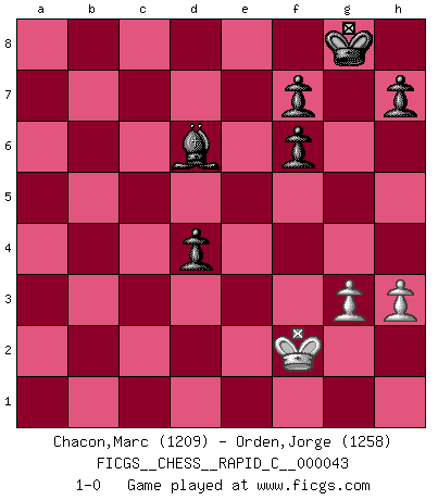 Last move : 1-0 2008 May 9 21:29:34 [Event "FICGS__CHESS__RAPID_C__000043"] [Site "FICGS"] [Date "2008.01.08"] [Round "1"] [White "Chacon,Marc"] [Black "Orden,Jorge"] [Result "1-0"] [WhiteElo "1209"] [BlackElo "1258"] 1.d4 d5 2.e3 Nf6 3.Nc3 e6 4.Bd3 Be7 5.Nf3 O-O 6.O-O a6 7.Ne5 c5 8.dxc5 Bxc5 9.b3 Nc6 10.Nxc6 bxc6 11.Bb2 a5 12.a3 Ba6 13.Bxa6 Rxa6 14.Qd3 Qa8 15.Na4 Bd6 16.Bxf6 gxf6 17.b4 axb4 18.axb4 Rxa4 19.Rxa4 Qxa4 20.e4 Qxb4 21.c3 Qxe4 22.Rd1 Qxd3 23.Rxd3 Ra8 24.g3 c5 25.Kg2 Ra3 26.Re3 e5 27.h3 d4 28.cxd4 Rxe3 29.fxe3 cxd4 30.exd4 exd4 31.Kf2 1-0 This chess game has been lost on time (started : 2008.01.08 8:33:32) Queen's pawn game Kingside Castling by player Black (move 5) Kingside Castling by player White (move 6) 10 pieces endgame at move 30 : White KPPP , Black KBPPPP WHITE : King + 3 Pawns BLACK : King + 1 Bishop 4 Pawns 9 pieces endgame at move 30 : White KPP , Black KBPPPP WHITE : King + 2 Pawns BLACK : King + 1 Bishop 4 Pawns Player White won this chess game. Follow this game move after move (download)Fischer sacrificed virtually everything most of us weakies (to use his term) value, respect, and cherish, for the sake of an artful, often beautiful board game, for the ambivalent privilege of being its greatest master. (Paul Kollar) Es gibt keine einzige Frau, der ich nicht einen Springer vorgeben könnte und trotzdem gewänne. (Robert James Fischer) El juego de Damas es para vagabundos. (Paul Morphy) J'apprécie les joueurs d'est-indienne, c'est grâce à eux que je nourris ma famille depuis tant d'années. (Petrosian) I just play for fun. (Anna Kournikova)