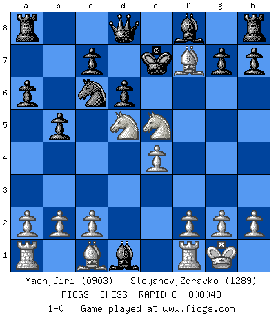 Last move : 1-0 2008 March 3 8:46:33 [Event "FICGS__CHESS__RAPID_C__000043"] [Site "FICGS"] [Date "2008.01.08"] [Round "1"] [White "Mach,Jiri"] [Black "Stoyanov,Zdravko"] [Result "1-0"] [WhiteElo "0903"] [BlackElo "1289"] 1.e4 e5 2.Nf3 Nc6 3.Bb5 Nge7 4.O-O a6 5.Ba4 Ng6 6.Nc3 b5 7.Bb3 d6 8.d4 Bg4 9.dxe5 Ngxe5 10.Nxe5 Bxd1 11.Bxf7+ Ke7 12.Nd5+ 1-0 Ruy Lopez : Cozio defense Kingside Castling by player White (move 4) Player White won this chess game. Follow this game move after move (download)He who fears an isolated Queen's Pawn should give up Chess. (Siegbert Tarrasch) Es tut gut, die Entwicklungsperiode von, [...] demokratischem Geist durchdringen zu lassen. Wie undemokratisch wäre es doch beispielsweise, den einen Offizier große Spaziertouren vornehmen zu lassen, während die anderen zu Hause säßen und sich entsetzlich langweilten. (Aaron Nimzowitsch) Aún el Rey más flojo huye despavorido ante la amenaza de un Jaque doble. (Aaron Nimzowitsch) Vous m'avez demandé de vous exposer quel est le fondement de la prière. Je ne fais que préparer les pièces du jeu sur la table... Nous sera-t-il permis d'en adopter les règles et si nous les appliquons scrupuleusement nous ne tarderons pas à faire mat le Roi divin ! Il ne pourra échapper à nos mains. (Sainte Thérèse d'Avila, Chemin de perfection) Empty your mind, be formless, shapeless — like water. (Bruce Lee)