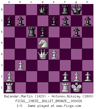 Last move : 1-0 2008 May 25 20:12:24 [Event "FICGS__CHESS__BULLET_BRONZE__000026"] [Site "FICGS"] [Date "2008.05.25"] [Round "1"] [White "Balander,Martin"] [Black "Antonov,Nikolay"] [Result "1-0"] [WhiteElo "1420"] [BlackElo "1800"] 1.e4 c5 2.Nf3 Nc6 3.d4 cxd4 4.Nxd4 g6 5.c4 Bg7 6.Be3 d6 7.Nc3 Nf6 8.Be2 O-O 9.O-O Ng4 10.Bxg4 Nxd4 11.Bxc8 Rxc8 12.Bxd4 Rxc4 13.Bxg7 Kxg7 14.b3 Rc6 15.Nd5 Kg8 16.Qd4 1-0 Sicilian : Accelerated Fianchetto, Maroczy bind, 6.Be3 Kingside Castling by player Black (move 8) Kingside Castling by player White (move 9) Player White won this chess game. Follow this game move after move (download)Chess demands total concentration. (Bobby Fischer) Schach ist eine Sache der genauen Beurteilung, wann man zuschlagen und wann man sich ducken muss. (Robert James Fischer) Robert Fischer es la ley hacia si mismo. (Larry Evans) Toutes les manuvres exécutées sur une colonne ouverte ont pour but ultime l'intrusion définitive sur la septième ou la huitième rangée, en plein cur de la position ennemie. (Aaron Nimzovitch) Games, world of games... There's always an opponent, and there's always a victim. (Revolver, movie)