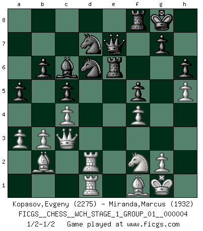 Last move : 1/2-1/2 2008 April 15 13:51:16 [Event "FICGS__CHESS__WCH_STAGE_1_GROUP_01__000004"] [Site "FICGS"] [Date "2008.01.08"] [Round "1"] [White "Kopasov,Evgeny"] [Black "Miranda,Marcus"] [Result "1/2-1/2"] [WhiteElo "2275"] [BlackElo "1932"] 1.d4 Nf6 2.c4 e6 3.Nc3 Bb4 4.Qc2 O-O 5.a3 Bxc3+ 6.Qxc3 b6 7.Nf3 Bb7 8.e3 d6 9.Be2 a5 10.b3 Ne4 11.Qc2 f5 12.O-O Nd7 13.Bb2 Qe7 14.Ne1 Qg5 15.Qc1 Qe7 16.Nd3 e5 17.Qc2 Rae8 18.dxe5 dxe5 19.Rad1 c5 20.f3 Nd6 21.Nf2 Bc6 22.Rd2 Rf6 23.Rfd1 Rg6 24.h4 Rf8 25.h5 Rh6 26.f4 exf4 27.exf4 Re6 28.Bf1 h6 29.Qc3 1/2-1/2 Nimzo-Indian : Classical variation Kingside Castling by player Black (move 4) Kingside Castling by player White (move 12) This chess game ended in a draw. Follow this game move after move (download)A good player is always lucky. (Jose Raul Capablanca) Über Kasparov: Es ist offensichtlich, daß er in einem totalitären Staat aufwuchs und deshalb zu diktatorischen Zügen neigt. (Viktor Kortschnoi) ¿Porque tengo que perder ante este idiota?. (Aron Nimzovich) Il n'y a pas de prix trop élevé au scalp de l'ennemi. (Koblentz) To send light into the darkness of men's hearts - such is the duty of the artist. (Schumann)