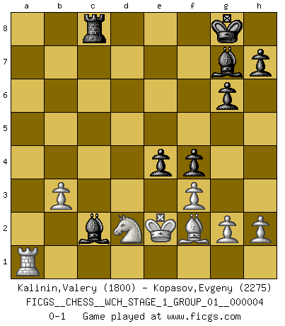 Last move : 0-1 2008 April 9 11:44:2 [Event "FICGS__CHESS__WCH_STAGE_1_GROUP_01__000004"] [Site "FICGS"] [Date "2008.01.08"] [Round "1"] [White "Kalinin,Valery"] [Black "Kopasov,Evgeny"] [Result "0-1"] [WhiteElo "1800"] [BlackElo "2275"] 1.d4 Nf6 2.c4 g6 3.Nc3 d5 4.Qb3 dxc4 5.Qxc4 Bg7 6.e4 O-O 7.Bf4 Na6 8.Nf3 c5 9.dxc5 Be6 10.Qb5 Bd7 11.Qxb7 Nxc5 12.Qc7 Nfxe4 13.Nxe4 Nxe4 14.Rd1 Qxc7 15.Bxc7 Be6 16.Bd3 Nc5 17.b3 Nxd3+ 18.Rxd3 Rfc8 19.Be5 Bf5 20.Rd1 f6 21.Bd4 e5 22.Be3 a5 23.Ke2 a4 24.Rc1 axb3 25.axb3 Bc2 26.Nd2 f5 27.f3 f4 28.Bf2 Ra2 29.Ra1 Rxa1 30.Rxa1 e4 0-1 King's Indian defense, 3.Nc3 Kingside Castling by player Black (move 6) Player Black won this chess game. Follow this game move after move (download)Checkers is for tramps. (Paul Morphy) Man wirke der falschen Auffassung entgegen, als ob jeder Zug Unmittelbares zu leisten habe; auch Werte- und Ruhezüge haben ihre Existenzberechtigung. (Aaron Nimzowitsch) La vida es como un juego de Ajedrez, cambiando con cada movimiento. (Proverbio Chino) Psychologiquement, tu dois avoir confiance en toi même, mais cette confiance doit être basée sur des faits. (Robert Fischer) The best weapon against an enemy is another enemy. (Friedrich Nietzsche)