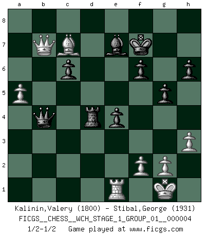 Last move : 1/2-1/2 2008 March 29 8:39:11 [Event "FICGS__CHESS__WCH_STAGE_1_GROUP_01__000004"] [Site "FICGS"] [Date "2008.01.08"] [Round "1"] [White "Kalinin,Valery"] [Black "Stibal,George"] [Result "1/2-1/2"] [WhiteElo "1800"] [BlackElo "1931"] 1.d4 Nf6 2.c4 e6 3.Nf3 c5 4.Nc3 cxd4 5.Nxd4 Bb4 6.Bg5 Qa5 7.Bd2 Qb6 8.e3 O-O 9.Bd3 Nc6 10.Nxc6 dxc6 11.O-O Rd8 12.Qc2 e5 13.a3 Be7 14.b4 Be6 15.c5 Qc7 16.Rfd1 g6 17.Ne4 Nd5 18.Nc3 b6 19.Nxd5 Bxd5 20.e4 Be6 21.Bc4 Bxc4 22.Qxc4 bxc5 23.bxc5 Qd7 24.Qa4 Qd4 25.Bb4 Qxe4 26.Rxd8+ Rxd8 27.Re1 Qd5 28.Qxa7 Kf8 29.h3 f6 30.Qb6 Qe6 31.Rb1 Kf7 32.Qb7 h6 33.Re1 e4 34.a4 Rd4 35.Ba5 g5 36.Bc7 Qd7 37.Qb6 Qd5 38.Qb7 Qxc5 39.a5 Qb4 1/2-1/2 Queen's pawn game Kingside Castling by player Black (move 8) Kingside Castling by player White (move 11) This chess game ended in a draw. Follow this game move after move (download)White lost because he failed to remember the right continuation and had to think up the moves himself. (Siegbert Tarrasch) Jeder leidlich begabte Spieler, er braucht keineswegs hervorragend veranlagt zu sein, kann es zum Meister bringen. Aber das ist ja auch gar nicht nötig! Der richtige Standpunkt ist es, zu seinem Vergnügen zu spielen, und man glaube ja nicht, dass der Genuss proportional dem Können sei. (Siegbert Tarrasch) Alekhine es un poeta que crea un trabajo de arte de algo que raramente inspiraría a otra persona a mandar una tarjeta postal. (Max Euwe) Le moment que je préfère le plus dans une rencontre, c'est celui où je sens que la personnalité de l'adversaire se brise. (Robert Fischer) A government big enough to give you everything you want is strong enough to take everything you have. (Thomas Jefferson)