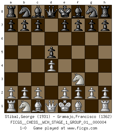 Last move : 1-0 2008 February 11 1:7:8 [Event "FICGS__CHESS__WCH_STAGE_1_GROUP_01__000004"] [Site "FICGS"] [Date "2008.01.08"] [Round "1"] [White "Stibal,George"] [Black "Gramajo,Francisco"] [Result "1-0"] [WhiteElo "1931"] [BlackElo "1362"] 1.d4 d5 2.Nf3 1-0 This chess game has been lost on time (started : 2008.01.08 19:32:51) Queen's pawn game Player White won this chess game. Follow this game move after move (download)The Chess pieces are the block alphabet which shapes thoughts; and these thoughts, although making a visual design on the chessboard, express their beauty abstractly, like a poem. (Marcel Duchamp) Karpov ist ein Museumsstück. (Garry Kasparov) Cada Peón es potencialmente una Reina. (James Mason) Toutes les manuvres exécutées sur une colonne ouverte ont pour but ultime l'intrusion définitive sur la septième ou la huitième rangée, en plein cur de la position ennemie. (Aaron Nimzovitch) If you are good, you will be assigned all the work. If you are really good, you will get out of it. (Dan Rotaru)