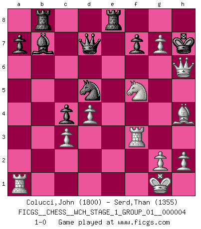 Last move : 1-0 2008 February 3 10:36:6 [Event "FICGS__CHESS__WCH_STAGE_1_GROUP_01__000004"] [Site "FICGS"] [Date "2008.01.08"] [Round "1"] [White "Colucci,John"] [Black "Serd,Than"] [Result "1-0"] [WhiteElo "1800"] [BlackElo "1355"] 1.c4 e6 2.Nc3 Nf6 3.d4 d5 4.cxd5 exd5 5.Bg5 Nbd7 6.e3 Bb4 7.Bd3 c5 8.Nge2 O-O 9.O-O c4 10.Bc2 h6 11.Bh4 Bxc3 12.bxc3 Re8 13.Qd2 Qa5 14.f3 b5 15.a4 bxa4 16.Bxa4 Qd8 17.Bc6 Rb8 18.e4 dxe4 19.fxe4 Qc7 20.e5 Qxc6 21.exf6 Bb7 22.Ng3 Nb6 23.fxg7 Nd5 24.Nf5 Kh7 25.Rf3 Qd7 26.Qxh6+ 1-0 English Opening Kingside Castling by player Black (move 8) Kingside Castling by player White (move 9) Player White won this chess game. Follow this game move after move (download)When in doubt... play Chess ! (Tevis) Gewinnen beim Schach fördert das Selbstvertrauen. Beim Sex spüre ich sowas nicht... (Garry Kasparov) La caracteristica mas importante en la posición del Ajedrez es la actividad de las piezas. Esto es absolutamente fundamental en todas las fases del juego: Apertura, Juego Medio y especialmente Finales. La limitación primordial en la actividad de una pieza, es la estructuración de los Peones. (Michael Stean) On croit qu'il y a plus de mauvais joueurs que de bons joueurs, c'est faux : Il y a autant de joueurs qui gagnent que de joueurs qui perdent. (Philippe Geluck) The right perception of any matter and a misunderstanding of the same matter do not wholly exclude each other. (Kafka's the trial)