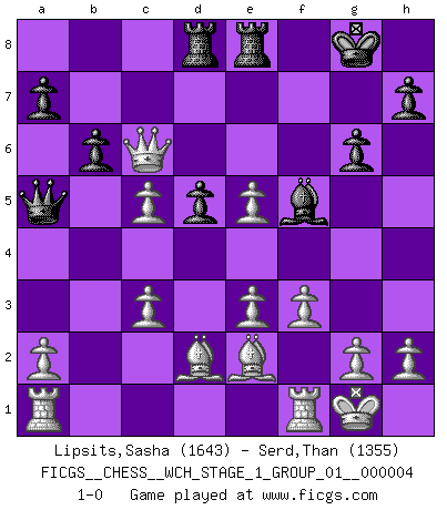 Last move : 1-0 2008 January 31 10:52:16 [Event "FICGS__CHESS__WCH_STAGE_1_GROUP_01__000004"] [Site "FICGS"] [Date "2008.01.08"] [Round "1"] [White "Lipsits,Sasha"] [Black "Serd,Than"] [Result "1-0"] [WhiteElo "1643"] [BlackElo "1355"] 1.Nf3 c6 2.c4 g6 3.d4 Bg7 4.Nc3 d5 5.e3 Nf6 6.Be2 Bf5 7.Qb3 Qb6 8.Qa3 Ne4 9.O-O O-O 10.Qxe7 Nxc3 11.bxc3 Nd7 12.Qa3 Nf6 13.Ne5 Ne4 14.f3 Nd6 15.Qxd6 Rad8 16.Qe7 Rfe8 17.Qxf7+ Kh8 18.c5 Qa5 19.Bd2 Bxe5 20.dxe5 b6 21.Qf6+ Kg8 22.Qxc6 1-0 Reti Opening Kingside Castling by player White (move 9) Kingside Castling by player Black (move 9) Player White won this chess game. Follow this game move after move (download)Chess is a part of culture and if a culture is declining then Chess too will decline. (Mikhail Botvinnik) Wenn Du nicht kämpfst, um anderen etwas zu beweisen, sondern nur für Dich selbst, dann bist du fast unbesiegbar. (Garry Kasparov) El Ajedrez es una manera fabulosa para que los niños aprendan a autovalorarse y a autoestimarse. (Saudin Robovic) Les échecs sont utiles à l'exercice de la faculté de penser et à celle de l'imagination. Car nous devons posséder une méthode élaborée pour atteindre des buts partout où nous devons conduire notre raison. (Leibnitz) A generalist learns less and less about more and more until he knows nothing about everything. (Author unknown)