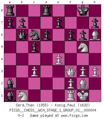 Last move : 0-1 2008 January 28 14:29:15 [Event "FICGS__CHESS__WCH_STAGE_1_GROUP_01__000004"] [Site "FICGS"] [Date "2008.01.08"] [Round "1"] [White "Serd,Than"] [Black "Konig,Paul"] [Result "0-1"] [WhiteElo "1355"] [BlackElo "1632"] 1.e4 c5 2.Nf3 Nc6 3.d3 Nf6 4.g3 g6 5.Bg2 d6 6.O-O Bg7 7.h3 O-O 8.Be3 Qb6 9.Qc1 Nxe4 10.dxe4 Bxb2 11.Qd1 Bxa1 12.c3 Be6 13.Bh6 Rfd8 14.Ng5 Bxa2 15.Qf3 f6 0-1 Sicilian defense Kingside Castling by player White (move 6) Kingside Castling by player Black (move 7) Player Black won this chess game. Follow this game move after move (download)The blunders are all there on the board, waiting to be made. (Savielly Tartakover) Es hat in meinem Leben Zeiten gegeben, in denen das Schachspiel, wenn nicht zum Lebenszweck, so doch zu einem regelrechten Lebensersatz geworden ist. Man fühlt sich in solchen Zeiten nicht so, als besäße man eine göttliche Gabe, sondern eher so, als sei man von ihr besessen. (Garry Kasparov) El tablero es el mundo, las piezas es el fenomeno del universo, las reglas del juego son lo que llamamos leyes de la naturaleza y el jugador del lado opuesto, se encuentra oculto a nuestra vista. (Thomas Huxley) La tactique est l'élément le plus important du milieu de jeu. (Siegbert Tarrasch) You have to believe in yourself. (Sun Tzu)
