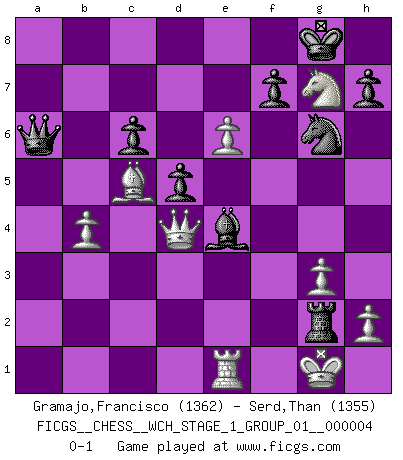 Last move : 0-1 2008 March 14 21:19:28 [Event "FICGS__CHESS__WCH_STAGE_1_GROUP_01__000004"] [Site "FICGS"] [Date "2008.01.08"] [Round "1"] [White "Gramajo,Francisco"] [Black "Serd,Than"] [Result "0-1"] [WhiteElo "1362"] [BlackElo "1355"] 1.Nf3 c6 2.e4 d5 3.Nc3 e6 4.e5 c5 5.Bb5+ Nc6 6.d4 Nge7 7.dxc5 Ng6 8.O-O Bxc5 9.Bxc6+ bxc6 10.a3 a5 11.Bg5 Qb6 12.b3 O-O 13.Na4 Qa7 14.Nxc5 Qxc5 15.Be3 Qe7 16.b4 Ba6 17.Bc5 Qd7 18.c4 Bxc4 19.Re1 Rfb8 20.g3 Qb7 21.Nd4 axb4 22.axb4 Rxa1 23.Qxa1 Ra8 24.Qc3 Ra2 25.f4 Qa6 26.f5 exf5 27.Nxf5 Bd3 28.Nxg7 Rc2 29.Qd4 Be4 30.e6 Rg2+ 0-1 Reti Opening Kingside Castling by player White (move 8) Kingside Castling by player Black (move 12) Player Black won this chess game. Follow this game move after move (download)Nowadays, when you're not a grandmaster at 14, you can forget about it. (Anand Viswanathan) Ein Gewinn durch eine ungenaue Kombination, sei sie auch noch so vorzeigbar, erfüllt mich mit Schaudern. (Wilhelm Steinitz) El juego del Ajedrez no es solamente una diversión quieta; algunas cualidades muy valuables de la mente se pueden adquirir y cultivar con el, como convertirlos en habitos disponibles para toda ocasión; ya que la vida es algo así como el Ajedrez. (Benjamin Franklin) Votre seul travail dans les ouvertures est d'obtenir un milieu de partie jouable. (Lajos Portish) Macintosh - we might not get everything right, but at least we knew the century was going to end. (Douglas Adams)