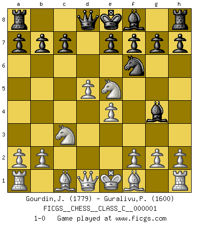 Last move : 1-0 2006 April 22 7:41:38 [Event "FICGS__CHESS__CLASS_C__000001"] [Site "FICGS"] [Date "2006.04.13"] [Round "1"] [White "Gourdin,Jose"] [Black "Guralivu,Paul-Iosif"] [Result "1-0"] [WhiteElo "1779"] [BlackElo "1600"] 1.d4 Nf6 2.c4 d5 3.cxd5 Nxd5 4.Nf3 Nc6 5.e4 Nf6 6.Nc3 Bg4 7.d5 Ne5 8.Nxe5 1-0 Queen's pawn game Player White won this chess game. Follow this game move after move (download)I'd rather have a Pawn than a finger. (Reuben Fine) Man kann eine Schachpartie nur gewinnen, wenn das Gleichgewicht gestört ist. In einer Stellung mit ungestörtem Gleichgewicht ist auch das größte Genie hilflos - in der Stellung steckt dann eben kein genialer Einfall. (Wilhelm Steinitz) La batalla por la última verdad nunca sera ganada. Y es por eso que el Ajedrez es tan fascinante. (Hans Kmoch) J'apprécie les joueurs d'est-indienne, c'est grâce à eux que je nourris ma famille depuis tant d'années. (Petrosian) A belief is an idea the mind possesses, an idea that possesses the mind. (Robert Oxden Bolton)