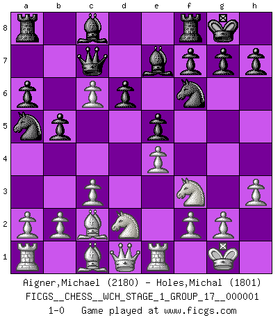Last move : 1-0 2006 September 1 7:9:33 [Event "FICGS__CHESS__WCH_STAGE_1_GROUP_17__000001"] [Site "FICGS"] [Date "2006.07.01"] [Round "1"] [White "Aigner,Michael"] [Black "Holes,Michal"] [Result "1-0"] [WhiteElo "2180"] [BlackElo "1801"] 1.e4 e5 2.Nf3 Nc6 3.Bb5 a6 4.Ba4 Nf6 5.O-O Be7 6.Re1 b5 7.Bb3 O-O 8.d4 d6 9.c3 Bg4 10.d5 Na5 11.Bc2 c6 12.h3 Bc8 13.dxc6 Qc7 14.Nbd2 1-0 This chess game has been lost on time (started : 2006.07.01 16:25:41) Ruy Lopez : Closed, 7...O-O Kingside Castling by player White (move 5) Kingside Castling by player Black (move 7) Player White won this chess game. Follow this game move after move (download)I'd rather have a Pawn than a finger. (Reuben Fine) Ich verlor meine Bürgerrechte, mein Gehalt wurde mir nicht mehr bezahlt und ich wurde zensiert und durfte nicht mehr ins Ausland reisen. [nach dem Match Fischer-Taimanov 6:0] (Mark Taimanov) El Ajedrez es un juego terrible. Si no dominas el centro, tu oponente tiene una posición mas libre. Si tu tienes el centro, entonces realmente tienes algo de que preocuparte. (Siegbert Tarrasch) Avec des compensations pour le matériel en plus... (Anonyme) The best weapon against an enemy is another enemy. (Friedrich Nietzsche)