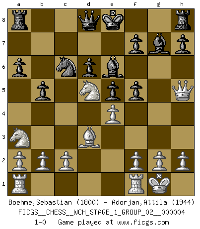 Last move : 1-0 2008 March 10 15:54:18 [Event "FICGS__CHESS__WCH_STAGE_1_GROUP_02__000004"] [Site "FICGS"] [Date "2008.01.08"] [Round "1"] [White "Boehme,Sebastian"] [Black "Adorjan,Attila"] [Result "1-0"] [WhiteElo "1800"] [BlackElo "1944"] 1.e4 c5 2.Nf3 Nc6 3.d4 cxd4 4.Nxd4 Nf6 5.Nc3 e5 6.Ndb5 d6 7.Bg5 a6 8.Na3 b5 9.Bxf6 gxf6 10.Nd5 f5 11.Bd3 Be6 12.O-O Bg7 13.Qh5 1-0 This chess game has been lost on time (started : 2008.01.08 19:35:43) Sicilian : Pelikan (Lasker/Sveshnikov) variation Kingside Castling by player White (move 12) Player White won this chess game. Follow this game move after move (download)I guess a certain amount of temperament is expected of Chess geniuses. (Ron Gross) Wenn ich gewinne bin ich ein Genie. Wenn nicht, dann bin ich keines. (Robert James Fischer) Por tratar de evitar la pérdida de una pieza, muchas personas han perdido una partida de Ajedrez. (Savielly Tartakover) On croit qu'il y a plus de mauvais joueurs que de bons joueurs, c'est faux : Il y a autant de joueurs qui gagnent que de joueurs qui perdent. (Philippe Geluck) Philosophers use a language that is already deformed as though by shoes that are too tight. (Ludwig Wittgenstein)