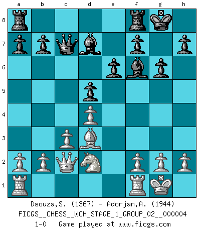 Last move : 1-0 2008 March 3 2:59:57 [Event "FICGS__CHESS__WCH_STAGE_1_GROUP_02__000004"] [Site "FICGS"] [Date "2008.01.08"] [Round "1"] [White "Dsouza,Stanislaus"] [Black "Adorjan,Attila"] [Result "1-0"] [WhiteElo "1367"] [BlackElo "1944"] 1.d4 d5 2.Nf3 Nf6 3.Bg5 e6 4.e3 Be7 5.Ne5 Nbd7 6.Nxd7 Bxd7 7.Bd3 O-O 8.Bxf6 Bxf6 9.c3 c5 10.Nd2 cxd4 11.exd4 Qc7 12.Qc2 g6 13.O-O 1-0 This chess game has been lost on time (started : 2008.01.08 19:35:43) Torre attack (Tartakower variation) Kingside Castling by player Black (move 7) Kingside Castling by player White (move 13) Player White won this chess game. Follow this game move after move (download)I won't play with you anymore. You have insulted my friend. - When an opponent cursed himself for a blunder. (Miguel Najdorf) Ich bin es gewohnt, das die Jugend mir überhaupt keinen Respekt entgegenbringt. (Alexander Morozewich) El tablero es el mundo, las piezas es el fenomeno del universo, las reglas del juego son lo que llamamos leyes de la naturaleza y el jugador del lado opuesto, se encuentra oculto a nuestra vista. (Thomas Huxley) Les échecs sont un jeu terrible. Si vous n'avez pas le centre, votre adversaire a une position plus libre. Par contre, si vous avez le centre, alors vous avez vraiment quelque chose pour laquelle vous inquiéter ! (Siegbert Tarrasch) Yoga is 99% practice and 1% knowledge. (Sri Krishna Pattabhi Jois)