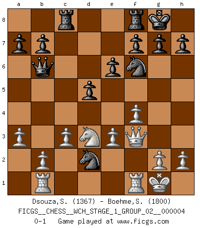 Last move : 0-1 2008 February 16 14:10:14 [Event "FICGS__CHESS__WCH_STAGE_1_GROUP_02__000004"] [Site "FICGS"] [Date "2008.01.08"] [Round "1"] [White "Dsouza,Stanislaus"] [Black "Boehme,Sebastian"] [Result "0-1"] [WhiteElo "1367"] [BlackElo "1800"] 1.d4 d5 2.Nf3 e6 3.Bf4 Nf6 4.Nc3 Bb4 5.a3 Bxc3+ 6.Bd2 Bxd2+ 7.Nxd2 Nbd7 8.e3 c5 9.dxc5 Nxc5 10.Bb5+ Bd7 11.Bxd7+ Qxd7 12.O-O O-O 13.Nf3 Nce4 14.Ne5 Qc7 15.Nd3 Nd6 16.f4 Qb6 17.Qf3 Rac8 18.c3 Nc4 19.Rab1 Nd2 0-1 Queen's pawn game Kingside Castling by player White (move 12) Kingside Castling by player Black (move 12) Player Black won this chess game. Follow this game move after move (download)The sign of a great Master is his ability to win a won game quickly and painlessly. (Irving Chernev) Drei Punkte vor allen anderen ist wie einer, der im weißen Anzug posiert, während der Rest in Müllsäcke gekleidet dasteht. (Viktor Kortschnoi) Por tratar de evitar la pérdida de una pieza, muchas personas han perdido una partida de Ajedrez. (Savielly Tartakover) Pour moi, les échecs ne sont pas un jeu mais un art. (Alexandre Alekhine) Good decisions come from experience, and experience comes from bad decisions. (Anonymous)