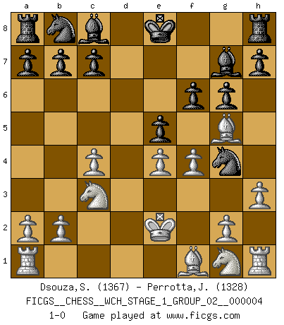 Last move : 1-0 2008 March 8 3:40:1 [Event "FICGS__CHESS__WCH_STAGE_1_GROUP_02__000004"] [Site "FICGS"] [Date "2008.01.08"] [Round "1"] [White "Dsouza,Stanislaus"] [Black "Perrotta,John Zach"] [Result "1-0"] [WhiteElo "1367"] [BlackElo "1328"] 1.d4 Nf6 2.c4 g6 3.Nc3 Bg7 4.e4 d6 5.Bg5 e5 6.dxe5 dxe5 7.f4 Qxd1+ 8.Kxd1 Ng4 9.Ke2 f6 10.h3 1-0 This chess game has been lost on time (started : 2008.01.08 19:35:43) King's Indian : Accelerated Averbakh system Player White won this chess game. Follow this game move after move (download)Capture of the adverse King is the ultimate but not the first object of the game. (William Steinitz) Moralische Siege zählen nicht. (Savielly Grigorievitsch Tartakower) El Ajedrez no es una pizca de inferior al violín, y tenemos un gran número de violinistas profesionales. (Mikhail Botvinnik) Nous vivons dans un monde échiquéen : chaque jour qui passe est un défi à relever. (Philosophe Sasha) I take risks, sometimes patients die, but not taking risks causes more patients to die. So I guess my biggest problem is I've been cursed with the ability to do the math. (Gregory House, House M.D.)