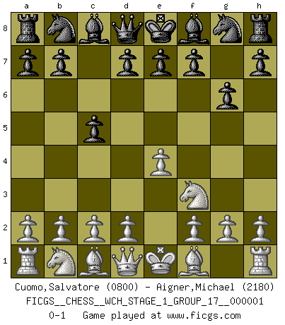 Last move : 0-1 2006 August 15 17:52:55 [Event "FICGS__CHESS__WCH_STAGE_1_GROUP_17__000001"] [Site "FICGS"] [Date "2006.07.01"] [Round "1"] [White "Cuomo,Salvatore"] [Black "Aigner,Michael"] [Result "0-1"] [WhiteElo "0800"] [BlackElo "2180"] 1.e4 c5 2.Nf3 g6 0-1 This chess game has been lost on time (started : 2006.07.01 16:25:41) Sicilian : Hungarian variation Player Black won this chess game. Follow this game move after move (download)When you are lonely, when you feel yourself an alien in the world, play Chess. This will raise your spirits and be your counselor in war. (Aristotle) Schach ist wie eine schöne Frau, zu der wir ständig zurückkehren, gleichviel, wie oft sie uns zurückweist. (Anonymous) La única cosa que los jugadores de Ajedrez tienen en común, es el Ajedrez. (Lodewijk Prins) Les erreurs sont comme les malheurs, elles n'arrivent jamais seules. (Siegbert Tarrasch) After growing wildly for years, the field of computing appears to be reaching its infancy. (John Pierce)