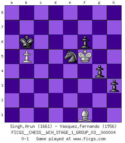 Last move : 0-1 2008 June 4 23:38:54 [Event "FICGS__CHESS__WCH_STAGE_1_GROUP_03__000004"] [Site "FICGS"] [Date "2008.01.08"] [Round "1"] [White "Singh,Arun"] [Black "Vasquez,Fernando"] [Result "0-1"] [WhiteElo "1661"] [BlackElo "1956"] 1.e4 e5 2.Nf3 d6 3.d4 exd4 4.Nxd4 Nf6 5.Nc3 g6 6.Be3 Bg7 7.f3 O-O 8.Qd2 Nc6 9.O-O-O Nxd4 10.Bxd4 Be6 11.Kb1 c5 12.Be3 Qa5 13.Bh6 Bxh6 14.Qxh6 Rad8 15.Qf4 Nh5 16.Qh4 b5 17.Be2 Kg7 18.Nd5 Bxd5 19.Rxd5 Nf6 20.R5d1 c4 21.c3 Rfe8 22.g4 d5 23.g5 Nh5 24.Rhe1 Qc7 25.Rxd5 Rxd5 26.exd5 Qd6 27.Qd4+ Kg8 28.Qd2 Nf4 29.h4 Kf8 30.Bd1 Rxe1 31.Qxe1 Qxd5 32.Bc2 Qxf3 33.a4 Nd3 34.Qg1 bxa4 35.Qxa7 Qf4 36.Qb6 h5 37.Qd8+ Kg7 38.Qd4+ Qxd4 39.cxd4 Ne1 40.Bxa4 Nf3 41.d5 Nxh4 42.d6 Kf8 43.Kc2 Nf5 44.d7 Ke7 45.Kc3 Ng7 46.Kxc4 Ne6 47.Kd5 Nxg5 48.b4 Ne6 49.Ke5 f6+ 50.Ke4 Nf8 51.Kf4 Nxd7 52.Bb3 Ne5 53.b5 Kd6 54.Bd1 Kc5 55.Be2 h4 56.Bf1 Kb6 57.Be2 g5+ 58.Kf5 h3 59.Bf1 g4 0-1 This chess game has been lost on time (started : 2008.01.08 19:37:13) Philidor : Exchange variation Kingside Castling by player Black (move 7) Queenside Castling by player White (move 9) 10 pieces endgame at move 46 : White KBPPP , Black KNPPP WHITE : King + 1 Bishop 3 Pawns BLACK : King + 1 Knight 3 Pawns 9 pieces endgame at move 47 : White KBPP , Black KNPPP WHITE : King + 1 Bishop 2 Pawns BLACK : King + 1 Knight 3 Pawns 8 pieces endgame at move 51 : White KBP , Black KNPPP WHITE : King + 1 Bishop 1 Pawn BLACK : King + 1 Knight 3 Pawns Player Black won this chess game. Follow this game move after move (download)There's never before been a Chess player with such a thorough knowledge of the intricacies of the game and such an absolutely indomitable will to win. I think Bobby is the greatest player that ever lived. (Lisa Lane) Im Fernschach kannst du während dem Spiel rauchen. (John Christen Knudsen) Es muy difícil jugar en contra de la teoría de Einstein. - en su primera derrota en contra de Fischer (Mikhail Tal) Il n'y a plus de joueurs du niveau de Jacob Murray dont la seule quête est le beau jeu, le plaisir de voir les pièces construire quelque chose. Sur 10 idées à la minute, 9 seront sans intérêt, la dernière s'avèrera géniale. (Christian Bauer) It is not titles that honor men, but men that honor titles. (Niccolo Machiavelli)
