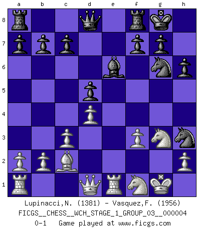 Last move : 0-1 2008 February 7 1:27:45 [Event "FICGS__CHESS__WCH_STAGE_1_GROUP_03__000004"] [Site "FICGS"] [Date "2008.01.08"] [Round "1"] [White "Lupinacci,Nicola"] [Black "Vasquez,Fernando"] [Result "0-1"] [WhiteElo "1381"] [BlackElo "1956"] 1.e4 e5 2.Nf3 d6 3.Bc4 Be7 4.O-O Nf6 5.c3 Nxe4 6.Re1 Nf6 7.d4 e4 8.Nfd2 d5 9.Bb3 Nc6 10.Nf1 Bg4 11.f3 exf3 12.gxf3 Be6 13.Bg5 h6 14.Bh4 Nh5 15.Bxe7 Nxe7 16.Ng3 Nf4 17.Bc2 O-O 18.Nd2 Neg6 19.Ndf1 Nh3+ 0-1 Philidor's defense Kingside Castling by player White (move 4) Kingside Castling by player Black (move 17) Player Black won this chess game. Follow this game move after move (download)Chess is in its essence a game, in its form an art, and in its execution a science. (Baron Tassilo) Fallen sollten polizeilich verboten werden. (Savielly Grigorievitsch Tartakower) El Ajedrez es un juego de pelea el cual es puramente intelectual e incluye la suerte. (Richard Reti) Je menace de comprendre la position. (Anonyme) There is no instance of a country having benefited from prolonged warfare. (Sun Tzu)