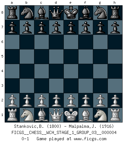 Last move : 0-1 2008 February 8 12:51:40 [Event "FICGS__CHESS__WCH_STAGE_1_GROUP_03__000004"] [Site "FICGS"] [Date "2008.01.08"] [Round "1"] [White "Stankovic,Branko"] [Black "Malpalma,Joaquim"] [Result "0-1"] [WhiteElo "1800"] [BlackElo "1916"] 0-1 This chess game has been lost on time (started : 2008.01.08 19:37:13) Player Black won this chess game. Follow this game move after move (download)A strong memory, concentration, imagination, and a strong will is required to become a great Chess player. (Bobby Fischer) Früher wurde jeder komplizierte Zug, jedes interessante Opfer mit großem Beifall und Enthusiasmus aufgenommen. Heute schaltet man einfach seinen Fritz an, und man kann sehen, was los ist, ob der Zug geht oder nicht. (Vladimir Kramnik) El muchacho (en ese entonces un niño de 12 años llamado Anatoly Karpov) no tiene ni idea de lo que es el Ajedrez y no hay futuro en absoluto para el en esta profesión. (Mikhail Botvinnik) Plusieurs personnes se sont demandées comment Tal faisait pour gagner... En fait, c'est très simple ! Il met ses pièces au centre de l'échiquier et les sacrifie quelque part ! (David Bronstein) Optimism is a variety of information deficit. Sometimes especially true for correspondence chess games. (Michael Aigner)