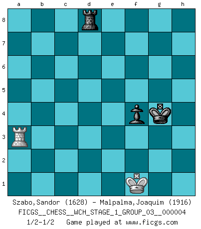Last move : 1/2-1/2 2008 July 10 12:30:49 [Event "FICGS__CHESS__WCH_STAGE_1_GROUP_03__000004"] [Site "FICGS"] [Date "2008.01.08"] [Round "1"] [White "Szabo,Sandor"] [Black "Malpalma,Joaquim"] [Result "1/2-1/2"] [WhiteElo "1628"] [BlackElo "1916"] 1.d4 d5 2.c4 dxc4 3.Nf3 Nf6 4.e3 e6 5.Bxc4 c5 6.O-O a6 7.Bb3 Nc6 8.Nc3 Be7 9.dxc5 Qxd1 10.Rxd1 Bxc5 11.Bd2 Ba7 12.Rac1 Bd7 13.Bc2 O-O 14.Ne4 Nxe4 15.Bxe4 Rfd8 16.Bc3 f6 17.h3 e5 18.Bd5+ Kh8 19.Nd2 Bg4 20.Nf3 Bh5 21.a3 Be8 22.b3 Rd6 23.Rd2 Rad8 24.Rcd1 Bb6 25.g4 Bc7 26.e4 b5 27.Rc1 Bb6 28.Kf1 a5 29.b4 a4 30.Nh4 Ne7 31.Nf5 Nxf5 32.gxf5 g5 33.Ke2 Kg7 34.f3 Bh5 35.R1c2 Kf8 36.Ba2 Rc6 37.Rxd8+ Bxd8 38.Bd5 Rc8 39.Be6 Rc7 40.Rc1 Ke7 41.Ba2 h6 42.Bd5 Rc8 43.Be6 Rc6 44.Bd5 Rc7 45.Bg8 Bf7 46.Bxf7 Kxf7 47.h4 gxh4 48.Kd3 Kg8 49.Rh1 Rd7+ 50.Ke2 Rg7 51.Bd2 Rg2+ 52.Kd1 Rg3 53.Rxh4 Rxf3 54.Bc1 Rg3 55.Kc2 Bb6 56.Rxh6 Kg7 57.Rh4 Bf2 58.Rh2 Be3 59.Bxe3 Rxe3 60.Rg2+ Kf8 61.Rd2 Rxe4 62.Rd5 Re3 63.Rxb5 Rxa3 64.Rb6 Kg7 65.Ra6 e4 66.b5 Rb3 67.Rxa4 Rxb5 68.Rxe4 Rxf5 69.Kd2 Kh6 70.Ke3 Kg5 71.Rb4 Rf1 72.Rb8 Ra1 73.Kf3 Ra3+ 74.Kg2 Re3 75.Kg1 Re2 76.Rc8 f5 77.Kf1 Rd2 78.Rf8 Kg4 79.Ra8 f4 80.Ra3 Rh2 81.Rb3 Ra2 82.Rd3 Kf5 83.Rd5+ Ke4 84.Rb5 Rd2 85.Rb1 Kf3 86.Rb3+ Kg4 87.Ra3 Rd8 1/2-1/2 QGA : Classical, 6...a6 Kingside Castling by player White (move 6) Kingside Castling by player Black (move 13) 10 pieces endgame at move 63 : White KRPPP , Black KRPPP WHITE : King + 1 Rook 3 Pawns BLACK : King + 1 Rook 3 Pawns 9 pieces endgame at move 63 : White KRPP , Black KRPPP WHITE : King + 1 Rook 2 Pawns BLACK : King + 1 Rook 3 Pawns 8 pieces endgame at move 67 : White KRPP , Black KRPP WHITE : King + 1 Rook 2 Pawns BLACK : King + 1 Rook 2 Pawns 7 pieces endgame at move 67 : White KRP , Black KRPP WHITE : King + 1 Rook 1 Pawn BLACK : King + 1 Rook 2 Pawns 6 pieces endgame at move 68 : White KRP , Black KRP WHITE : King + 1 Rook 1 Pawn BLACK : King + 1 Rook 1 Pawn 5 pieces endgame at move 68 : White KR , Black KRP WHITE : King + 1 Rook BLACK : King + 1 Rook 1 Pawn This chess game ended in a draw. Follow this game move after move (download)We must make sure that Chess will not be like a dead language, very interesting, but for a very small group. (Sytze Faber) Kein Großmeister ist normal. Sie unterscheiden sich nur im Ausmaß Ihrer Verrücktheit. (Viktor Kortschnoi) En un gambito tu regalas un Peón por el bién de tomar un juego perdido. (Samuel Standige Boden) Demandez au pauvre Cg1 ce qu'il en pense. Eduard Gufeld à propos de la variante Saemisch de l'Est-Indienne. I couldn't make any sense out of what this particular thread is about. It sounds like R2 D2 computer speaking. A space fight ?!? Some 'command' problems in Moscow ? Some killers & narcotic addicts attacking some game & a god wannabe ?? (Dinesh De Silva, lost in a russian conflict in FICGS forum)