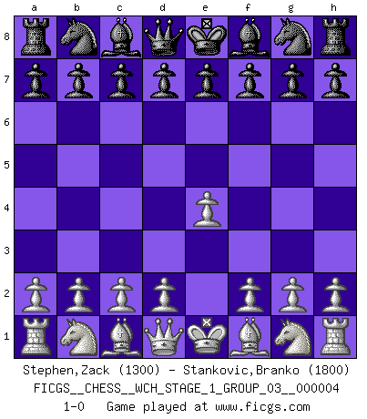 Last move : 1-0 2008 February 13 13:22:29 [Event "FICGS__CHESS__WCH_STAGE_1_GROUP_03__000004"] [Site "FICGS"] [Date "2008.01.08"] [Round "1"] [White "Stephen,Zack"] [Black "Stankovic,Branko"] [Result "1-0"] [WhiteElo "1300"] [BlackElo "1800"] 1.e4 1-0 This chess game has been lost on time (started : 2008.01.08 19:37:13) King's pawn Opening Player White won this chess game. Follow this game move after move (download)First-class players lose to second-class players because second-class players sometimes play a first-class game. (Siegbert Tarrasch) Jede Eröffnung ist gut genug um gespielt zu werden, wenn nur ihr Ruf schlecht genug ist. (Savielly Grigorievitsch Tartakower) ¿Cual es el objetivo de jugar una apertura de gambito?... Para adquirir una reputación de ser un jugador apuesto a costo de perder el juego. (Siegbert Tarrasch) Les sacrifices démontrent seulement que quelqu'un a gaffé. (Savielly Tartacover) It is the aim of the modern school, not to treat every position according to one general law, but according to the principle inherent in the position. (Richard Reti)