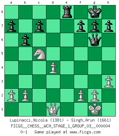 Last move : 0-1 2008 April 12 7:31:35 [Event "FICGS__CHESS__WCH_STAGE_1_GROUP_03__000004"] [Site "FICGS"] [Date "2008.01.08"] [Round "1"] [White "Lupinacci,Nicola"] [Black "Singh,Arun"] [Result "0-1"] [WhiteElo "1381"] [BlackElo "1661"] 1.e4 e5 2.Nf3 Nc6 3.Bc4 Bc5 4.c3 d6 5.d4 exd4 6.cxd4 Bb4+ 7.Bd2 Bxd2+ 8.Nbxd2 Nf6 9.O-O O-O 10.h3 d5 11.exd5 Nxd5 12.Re1 Bf5 13.Rc1 Nb6 14.Nb3 Nxc4 15.Rxc4 Qd6 16.Rc1 Nb4 17.Ra1 Nc2 18.Nh4 Bg6 19.Nxg6 Qxg6 20.Re7 Nxa1 21.Nxa1 Rac8 22.Nb3 Rfe8 23.Rxe8+ Rxe8 24.Nc5 b6 0-1 This chess game has been lost on time (started : 2008.01.08 19:37:13) Giuoco Piano Kingside Castling by player White (move 9) Kingside Castling by player Black (move 9) Player Black won this chess game. Follow this game move after move (download)Without error there can be no brilliancy. (Emanuel Lasker) Ich weiss nicht was Gott gegen mich auf 1.e4 antworten würde. (Robert James Fischer) Uno por uno, yo los acribillé, mi superioridad muy pronto se volvio aparente. (Jose Capablanca) Mais l'homme est une créature légère et illogique : semblable au joueur d'échecs, il n'aime que le processus du but à atteindre, non le but lui-même. (Dostoïevsky) Hold em is to stud what chess is to checkers. (Johnny Moss)