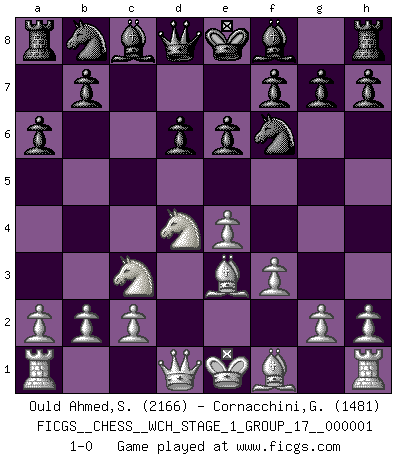 Last move : 1-0 2006 August 10 17:14:25 [Event "FICGS__CHESS__WCH_STAGE_1_GROUP_17__000001"] [Site "FICGS"] [Date "2006.07.01"] [Round "1"] [White "Ould Ahmed,Samy"] [Black "Cornacchini,Gabriele"] [Result "1-0"] [WhiteElo "2166"] [BlackElo "1481"] 1.e4 c5 2.Nf3 d6 3.d4 cxd4 4.Nxd4 Nf6 5.Nc3 a6 6.Be3 e6 7.f3 1-0 This chess game has been lost on time (started : 2006.07.01 16:25:41) Sicilian : Najdorf, Byrne (English) attack Player White won this chess game. Follow this game move after move (download)Capture of the adverse King is the ultimate but not the first object of the game. (William Steinitz) Schach ist Krieg, im Schach geht es um testosterongesteuerte Urschreie. (Garry Kasparov) Tu cuerpo tiene que estar en óptima condición. Tu Ajedrez se deteriora como lo hace tu cuerpo. No puedes separar la mente y el cuerpo. (Bobby Fischer) Il a essayé de se convaincre qu'il pourrait empêcher toutes les erreurs et ne jamais perdre. L'horreur ! Gary Kasparov au sujet de Robert Fischer. The problem with manipulation is that people can turn on you. (Horatio Caine, C.S.I. Miami)