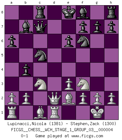 Last move : 0-1 2008 April 15 7:49:7 [Event "FICGS__CHESS__WCH_STAGE_1_GROUP_03__000004"] [Site "FICGS"] [Date "2008.01.08"] [Round "1"] [White "Lupinacci,Nicola"] [Black "Stephen,Zack"] [Result "0-1"] [WhiteElo "1381"] [BlackElo "1300"] 1.d4 d5 2.c4 c6 3.Nc3 Nf6 4.Nf3 e6 5.e3 Nbd7 6.Bd3 dxc4 7.Bxc4 b5 8.Bd3 a6 9.O-O Bb7 10.Qc2 c5 11.dxc5 Nxc5 12.Be2 Rc8 13.Qd2 Qc7 14.Rd1 b4 0-1 This chess game has been lost on time (started : 2008.01.08 19:37:13) QGD Slav defense Kingside Castling by player White (move 9) Player Black won this chess game. Follow this game move after move (download)The chessboard is the world, the pieces are the phenomena of the Universe, the rules of the game are what we call the laws of Nature and the player on the other side is hidden from us. (Thomas Huxley) Kasparov stellt für gewöhnlich die Regeln auf und bricht sie dann selbst wieder. (Alexej Shirov) Los errores estan ahí, esperando a que se cometan. (Savielly Tartakower) Le joueur d'Echecs qui veut atteindre le top est obligé de développer son propre credo créatif. Alexeï Stepanovicth Souétine. Il est facile d'écrire des livres ! Ce qui est difficile, c'est de jouer ! (Alexeï Stepanovicth Souétine) Whatever you do, don't be bored. This is absolutely the most exciting time we could have possibly hoped to be alive. And things are just starting. (From movie Waking life)
